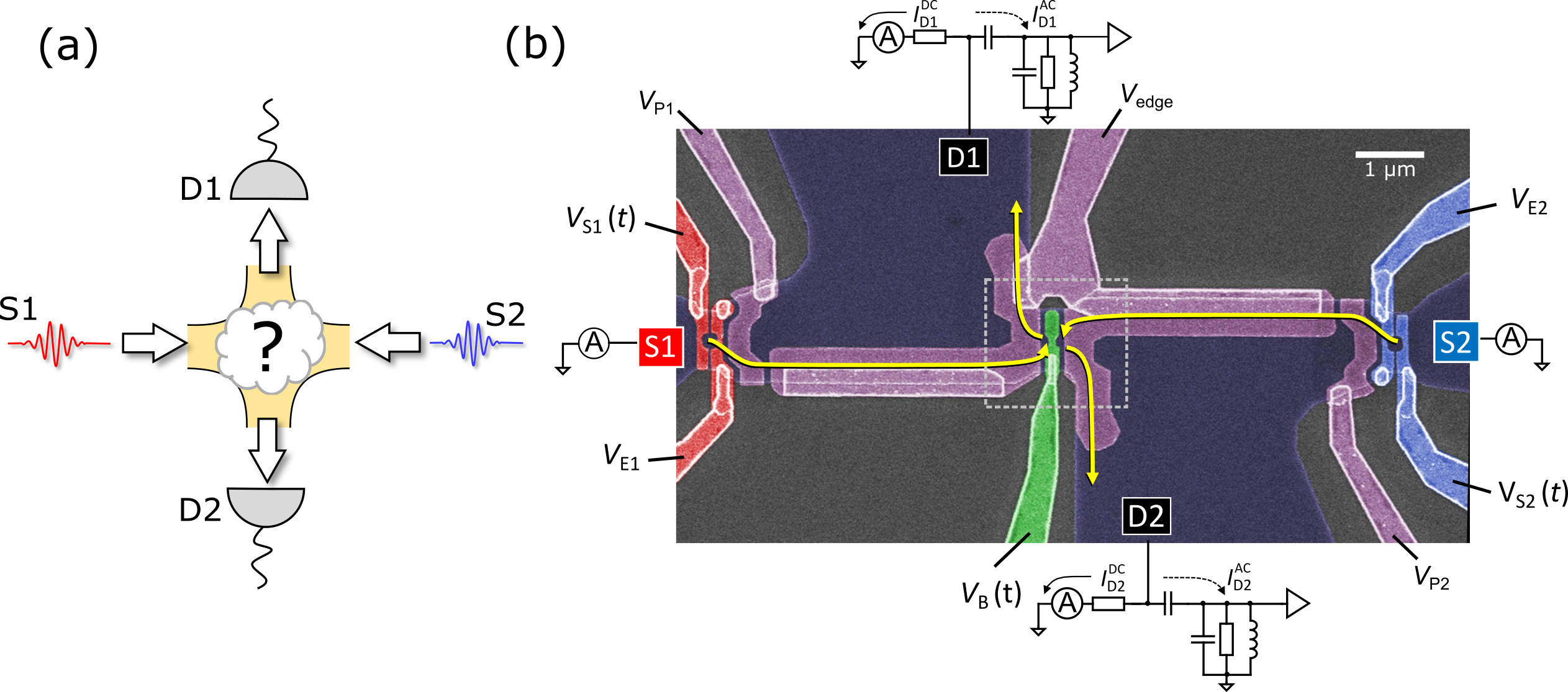 To explore this possibility, we developed the electron collider shown in Figure 1b. This uses surface gates on a GaAs heterostructure to define pumps that support high energy (>100 meV) emission and well-defined emission timing (<5 ps). We use this device to detect the outcomes of electron collisions between electrons of equal energy, but with varying arrival time Δt = t2 - t1 , which determines whether electrons collide or miss each other. We also vary the height of the barrier EB used as a beam splitter, a component which typically provides information on electron energy [4]. For readout, we measure the mean current distribution and the shot noise fluctuations. Taken together, these enable a very detailed analysis of the detector collision statistics Pnm, the probability of electrons leave in the same (P02 or P20) or different (P11) output channels (P20 + P02 + P11 = 1).