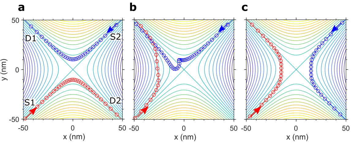 The Coulomb-dominated model predicts some distinctive effects. One is an order-of-arrival effect which causes the first electron to reach the saddle point and then "hold the ground", repelling the other electron without having its ultimate trajectory changed (see Figure 3b). This gives preferential transmission of one electron depending on the relative arrival time. We have confirmed that this is present in the experimental data, along side the more straightforward outcomes of missing each other (Figure 3a) and synchronized collision (see Figure 3c).