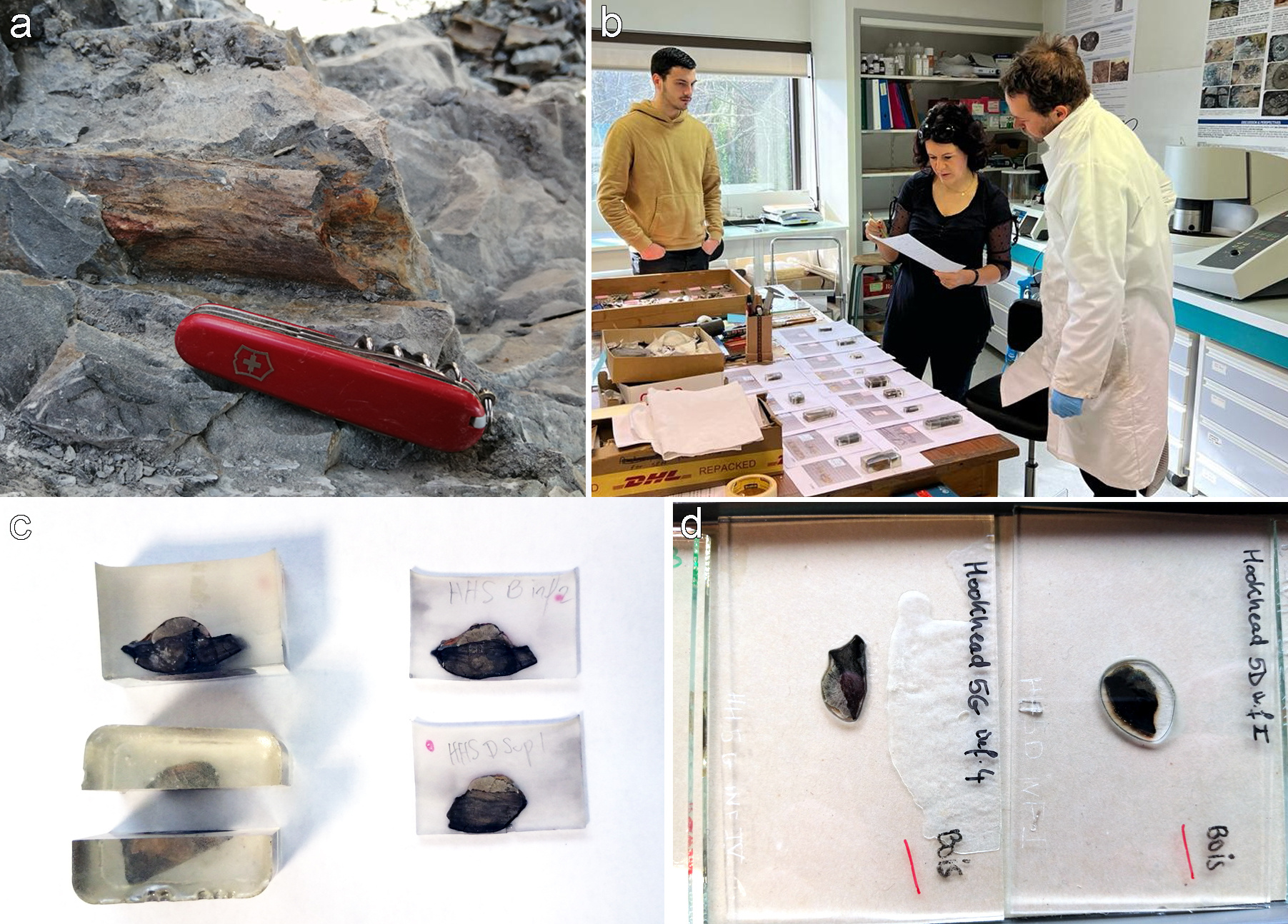 Fig.3. Specimen preparation. (a) small 3D plant axis in the field. (b) some of the authors of the study (Durieux, Decombeix & Ramel) in the palaeobotany lab in UMR AMAP Montpellier, looking at specimens in preparation. (c) portions of the wood specimen with tyloses embedded in epoxy; (d) two of the sections mounted on slides for observation.