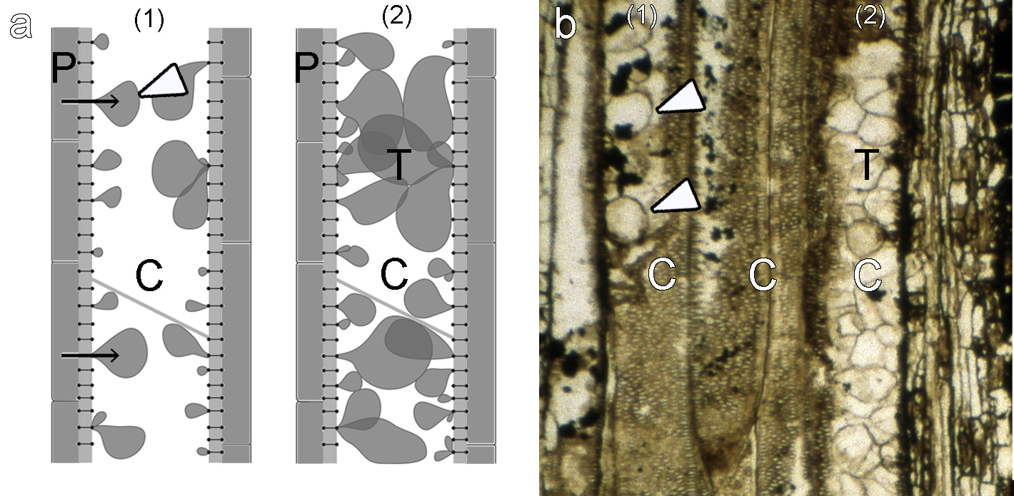 One important feature that can be observed in certain well-preserved plant fossils is the presence of tyloses (Fig. 2) in the xylem. Tyloses are bubble-like projections of parenchyma cells that extend into a neighboring conducting cell. They can completely block the conducting cell and have a role in heartwood formation, protection against pathogens (e.g. fungi), and preventing the spread of embolism (i.e. air in the conducting cells). Thus, the fossil record of tyloses contributes to our understanding of the evolution of the vascular system, along with the mechanisms that protect it from biotic and abiotic stresses.