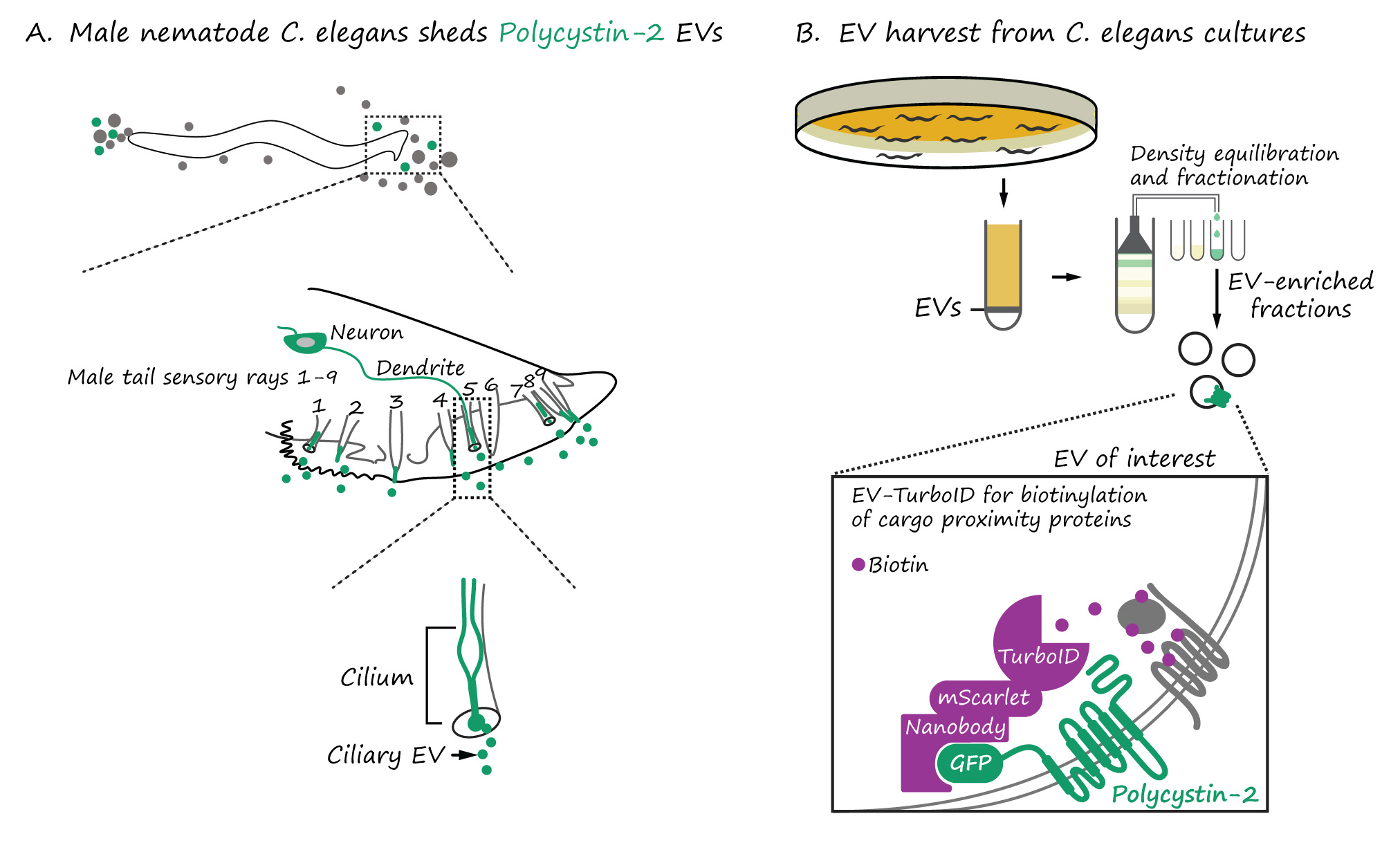 To solve this, we developed EV-TurboID, a modular proximity labeling system in which an engineered biotin ligase (TurboID) is tethered to polycystin-2 via a nanobody. This enzyme tags proteins that linger near polycystin-2, generating a high-resolution “proximity map” of the polycystin EV cargo.