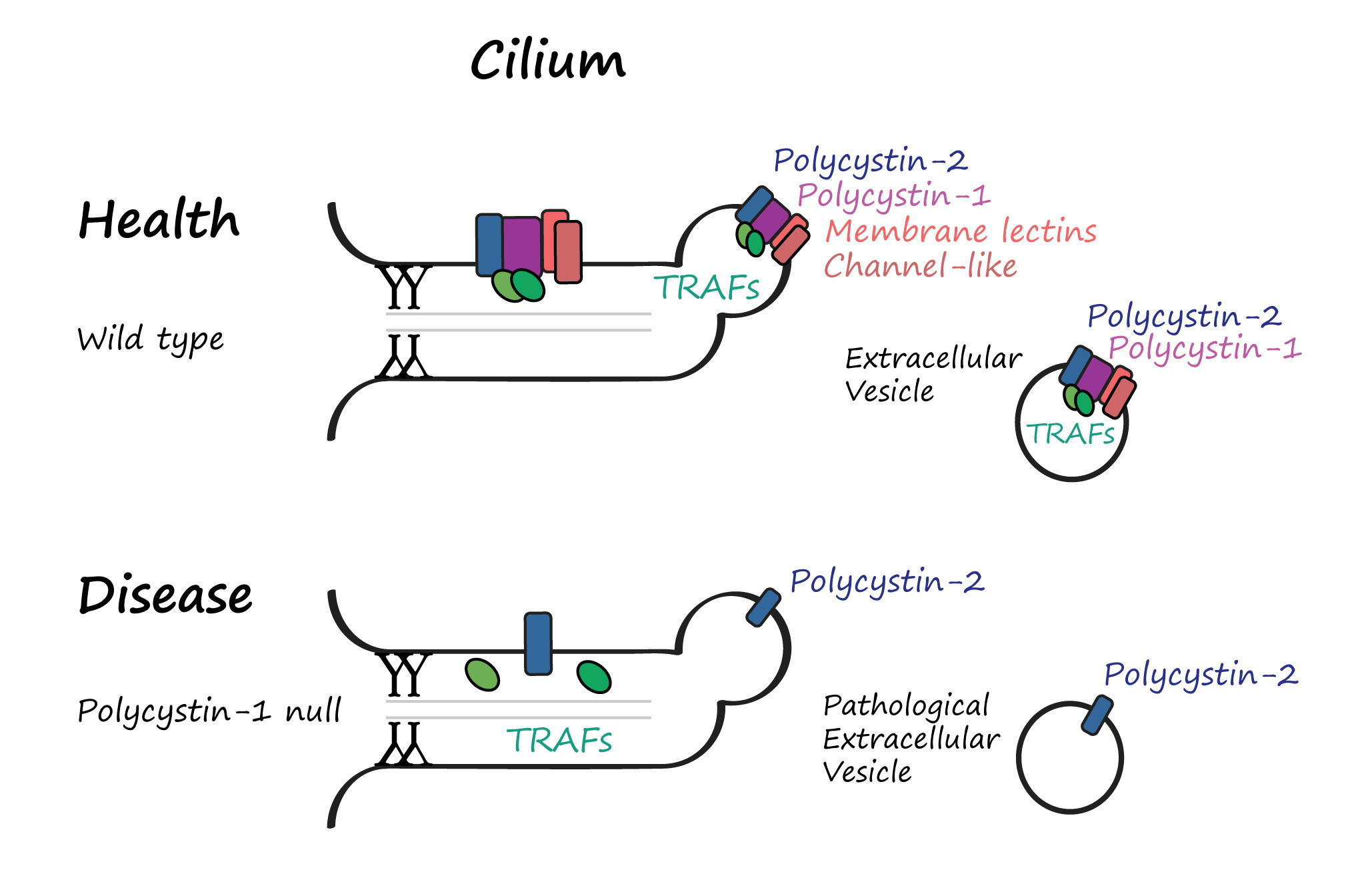 That wasn’t all. TRAF proteins, we found, didn’t just randomly drift into EVs. Their loading was conditional - dependent on polycystin-1 (LOV-1). Without LOV-1, they entered the cilium but were excluded from the tip and EVs. It was as if LOV-1 served as a molecular bouncer permitting entry into the vesicular club only when present.