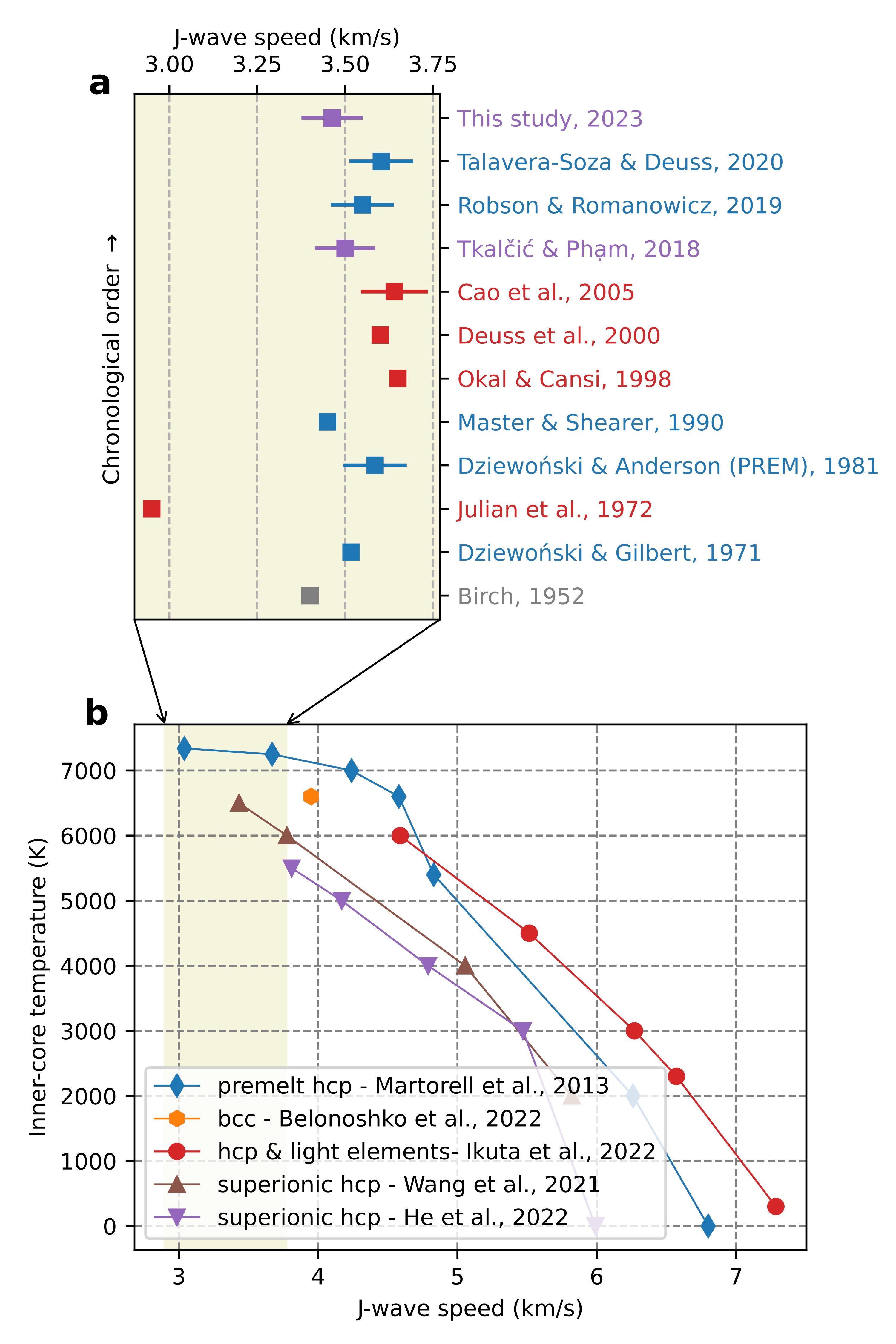 Compilation of J-wave speed estimates from seismological observations and recent mineral physics simulations. a Different value of J-wave speeds obtained from multiple IC-solidity studies. Colours represent different methodologies (blue: normal modes, red: shear body waves, purple: coda-correlation wavefield, and grey: mineral physics estimates). Squares denote the averaged J-wave speeds, and the bars represent the range of J-wave speeds from the inner-core boundary (ICB) to the Earth’s centre, available in some studies. b Summary of recent mineral physics hypotheses providing possible explanations for seismologically observed low J-wave speeds. Coloured lines show different J-wave speeds as functions of temperatures at 360 GPa, the pressure at the Earth’s centre. The shaded area corresponds to the range of J-wave speeds shown in panel (a).