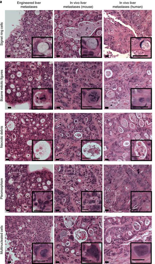Figure 2. Engineered HT-29 liver metastases (left panel), liver metastases formed following intrasplenic injection of HT-29 cells (middle panel), and liver metastases biopsied from late stage human colorectal cancer patients (right panel) all demonstrate classic histologic features of liver metastases of gastrointestinal origin. Scale bars, 20 µm (adapted from Figure 3 of our paper).