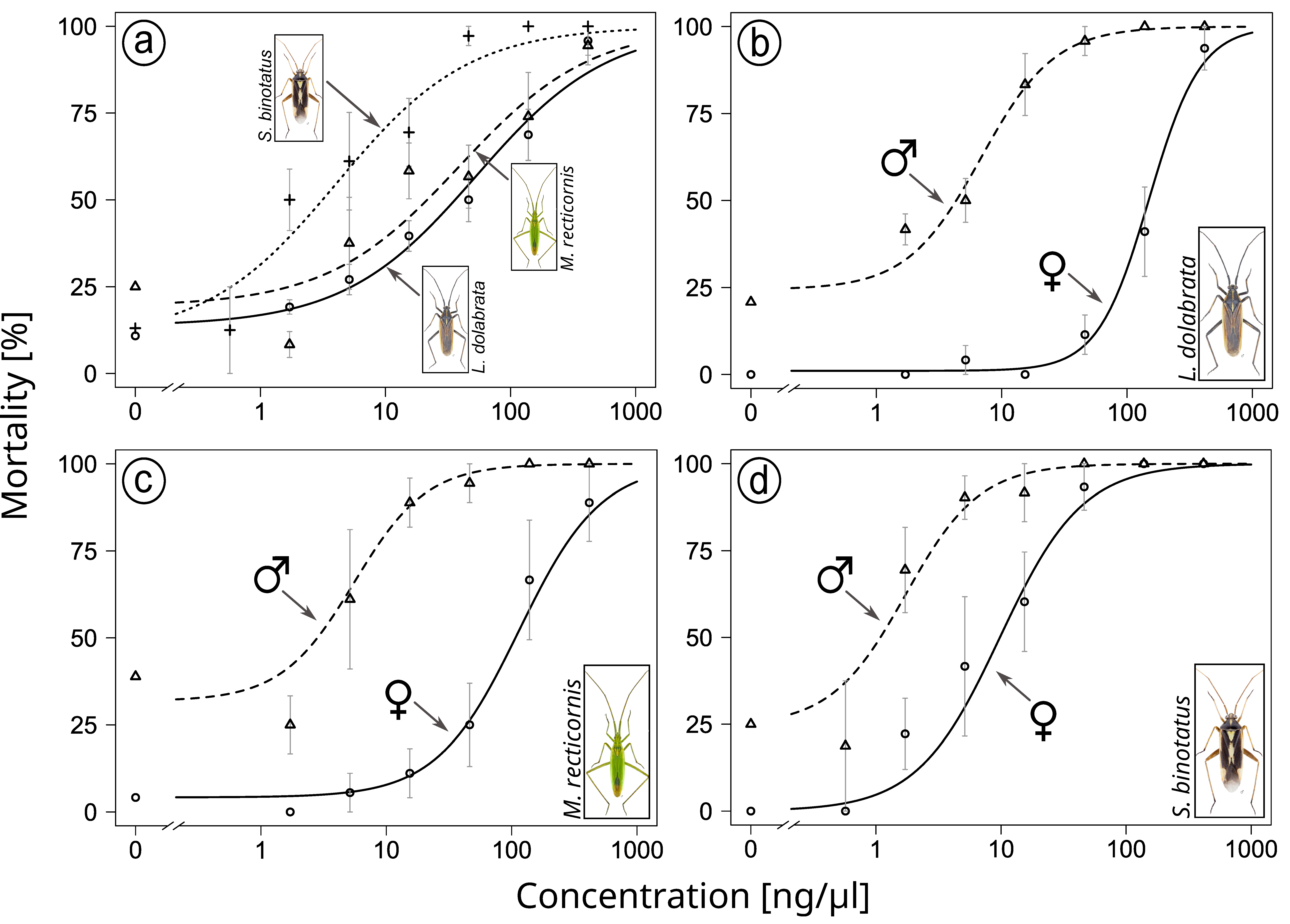 a Dose-response curves for all species, b separated by sex for Leptopterna dolabrata, c separated by sex for Megaloceroea recticornis, d separated by sex for Stenotus binotatus. Insect images © Gerhard Strauss, Biberach, Germany.