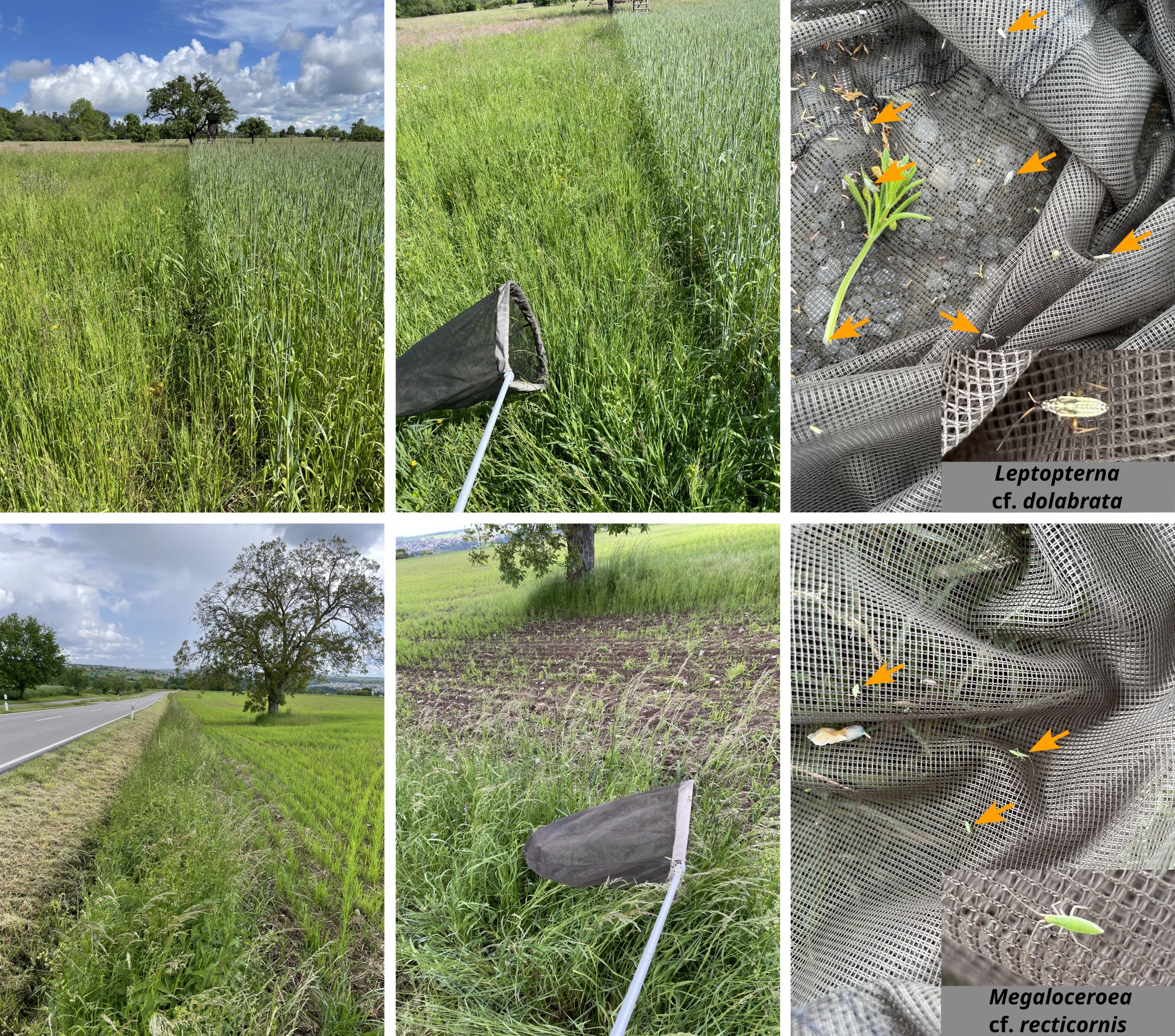 Top row images: sweep net sample of a meadow next to a cereal field. The first two metres of the meadow adjacent to the field were sampled. Orange arrows indicate nymphal stages of plant bugs (Leptopterna cf. dolabrata). Bottom row images: Sweep net sample from a grass-dominated field margin of a cereal field. Orange arrows indicate nymphal stages of plant bugs (Megaloceroea cf. recticornis). All insects were subsequently released.