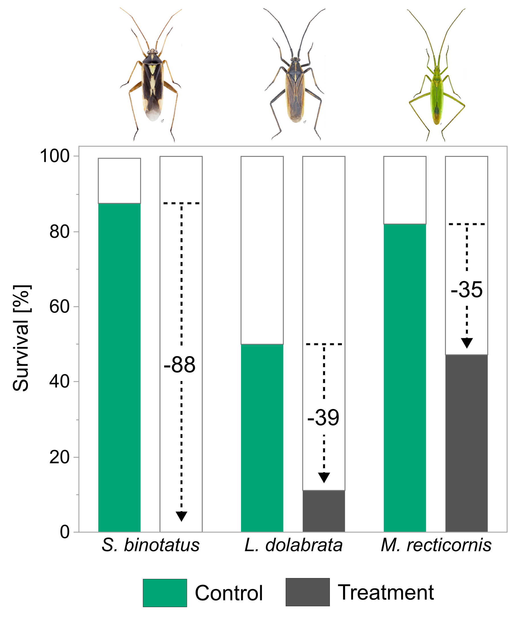 Plants were sprayed with insecticide two days prior to plant bug release. Survival rates at day four are given for Stenotus binotatus, Leptopterna dolabrata and Megaloceroea recticornis for the control (green) and the insecticide treatment (grey). Note that no individuals of S. binotatus survived the insecticide treatment and therefore no bar is shown. Black dashed lines in combination with numbers indicate percentage difference between survival in the control and treatment of the respective species. Insect images © Gerhard Strauss, Biberach.