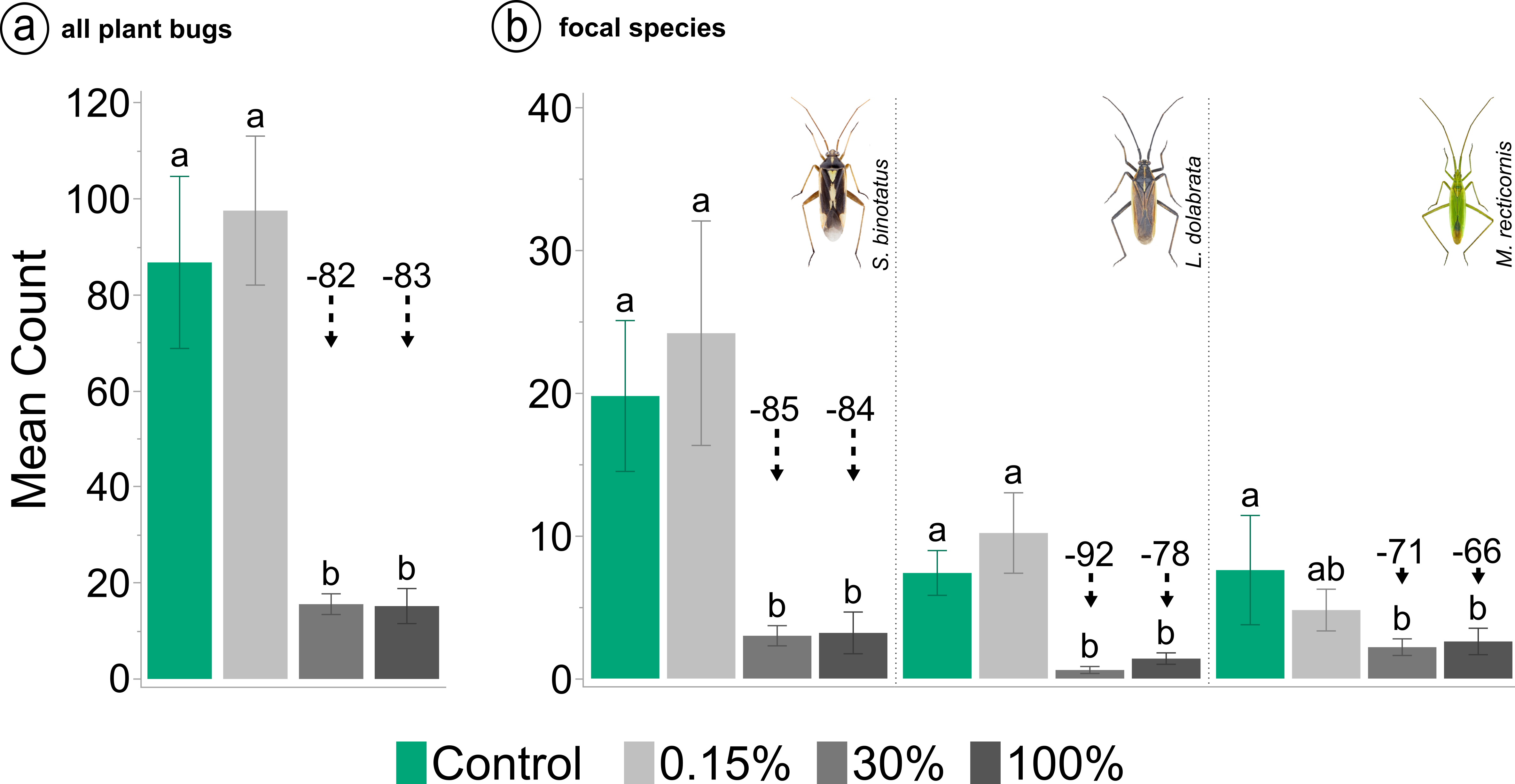 a Mean number of plant bugs (nymphs and adults) two days after insecticide application. b Mean number of adult plant bugs two days after insecticide application separated by species. Stenotus binotatus (left), Leptopterna dolabrata (centre) and Megaloceroea recticornis (right). Means not sharing the same letter are significantly different. Black dashed arrow lines in combination with numbers above bars indicate percentage difference to the control. Insect images © Gerhard Strauss, Biberach, Germany.
