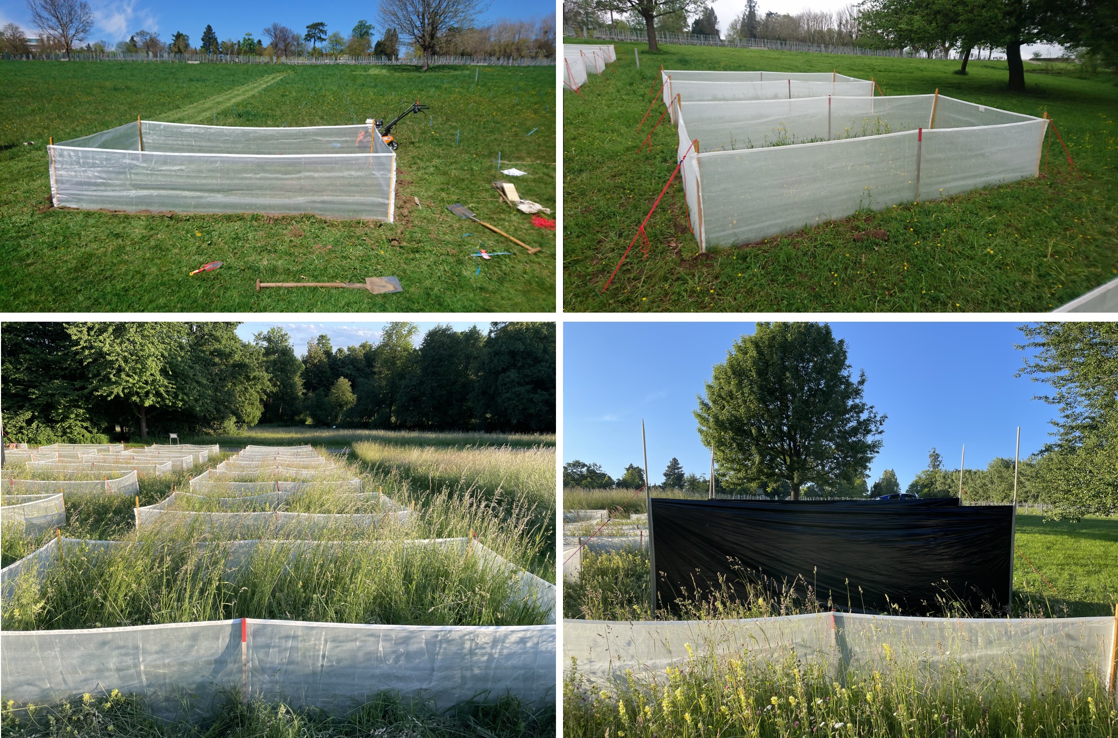 Bottom right image shows plastic sheeting around individual enclosures during insecticide application.