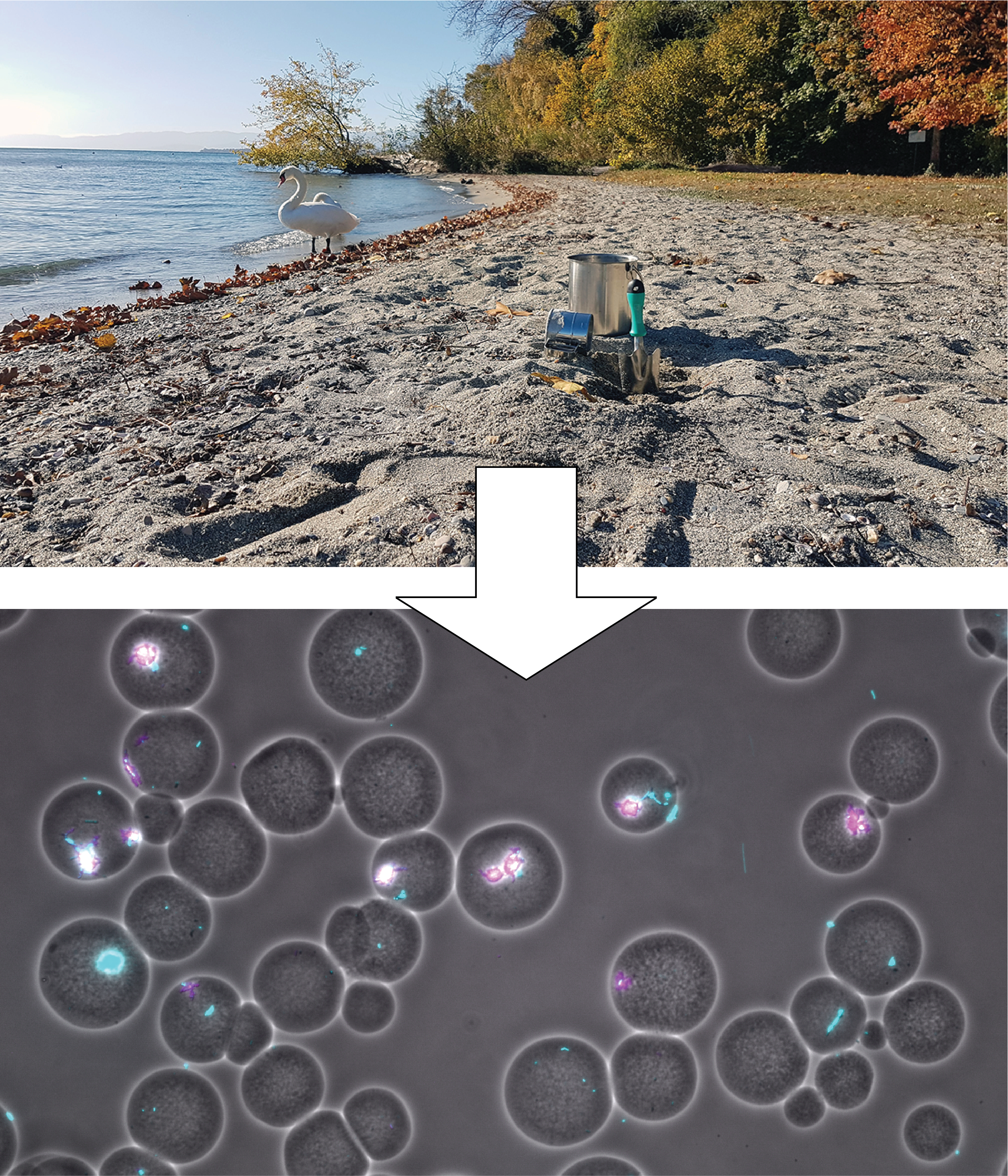 From previous work in the lab, we had experience with agarose mini-beads, and we felt that they could be used as appropriate containers to embed founder cell pairs, which we could then incubate under defined conditions. Cell division would result in the formation of small expanding colonies, which we could stain with a fluorescent dye and image. Indeed we managed to extract cells from a sandy soil from a Lake Geneva beach and produced millions of beads with random founder cells. We also observed plentiful growth, causing the need to reduce carbon amounts in the growth medium to a low level in order to prevent cells to burst from the beads.