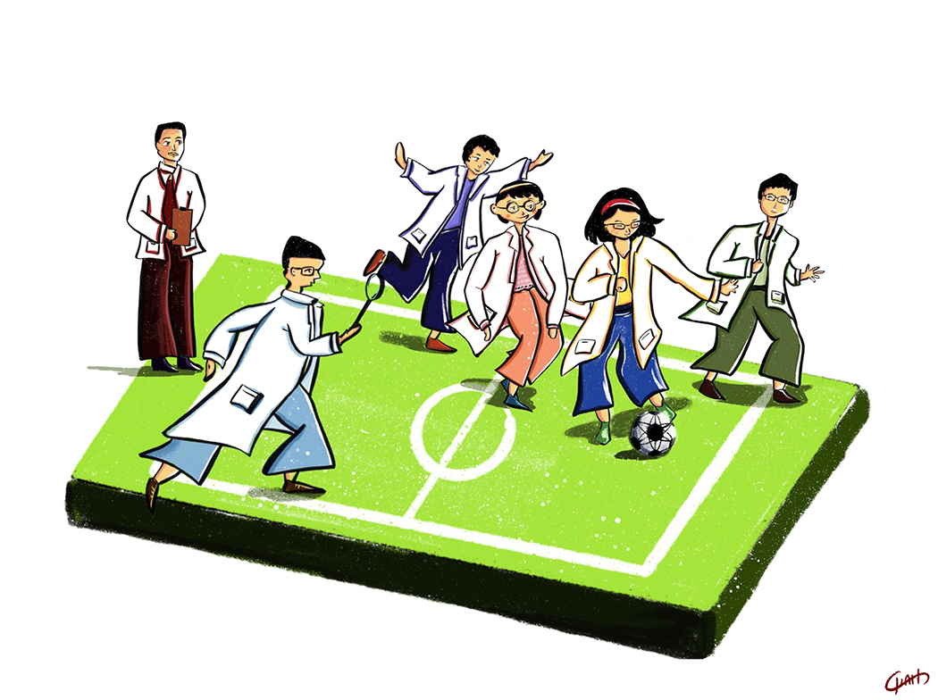 Research is a team sport. In football, you pass the ball, and then trust that your teammates will find you in a good position to score. In research, sharing the workload with your team members, and finishing your part efficiently will create a special connection between you and your teammates. (© drawing courtesy of Anh Hoang Ho)