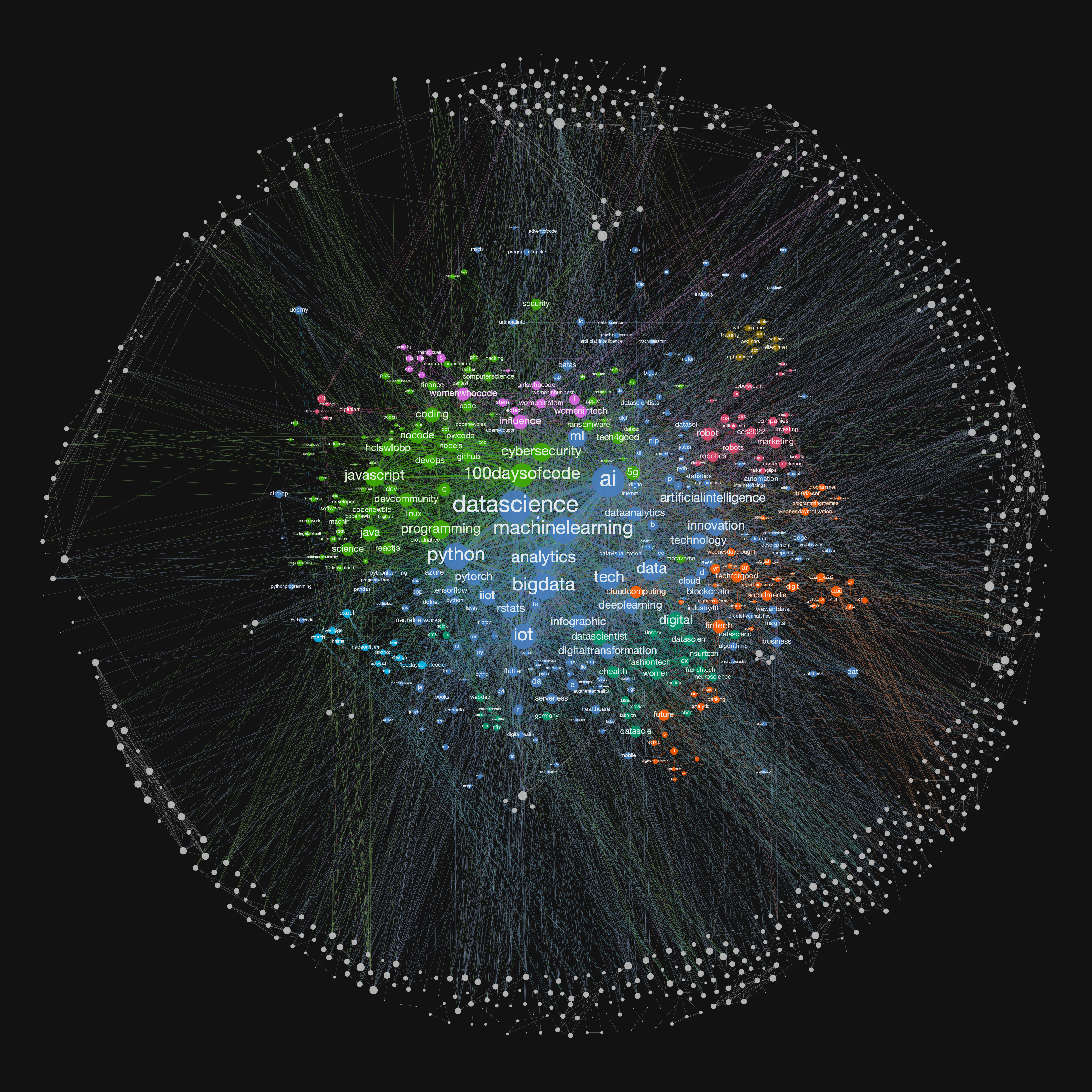 Figure 1: Data science trends on Twitter in December 2021 — tweet hashtag co-occurrence network. Each node represents a hashtag, while connections measure the number of times two tags were co-tweeted. Node size corresponds to node degree, while node color shows the network communities.