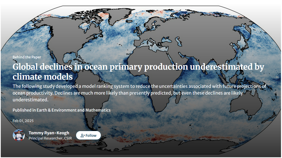 In this Behind the Paper post, @Tommy Ryan-Keogh reveals that global declines in ocean primary production are far more likely than many climate models currently suggest. By combining satellite observations dating back to 1998 with multiple productivity algorithms, the team shows a widespread downward trend in phytoplankton productivity, closely linked to rising ocean temperatures and changes in nutrient and light availability.