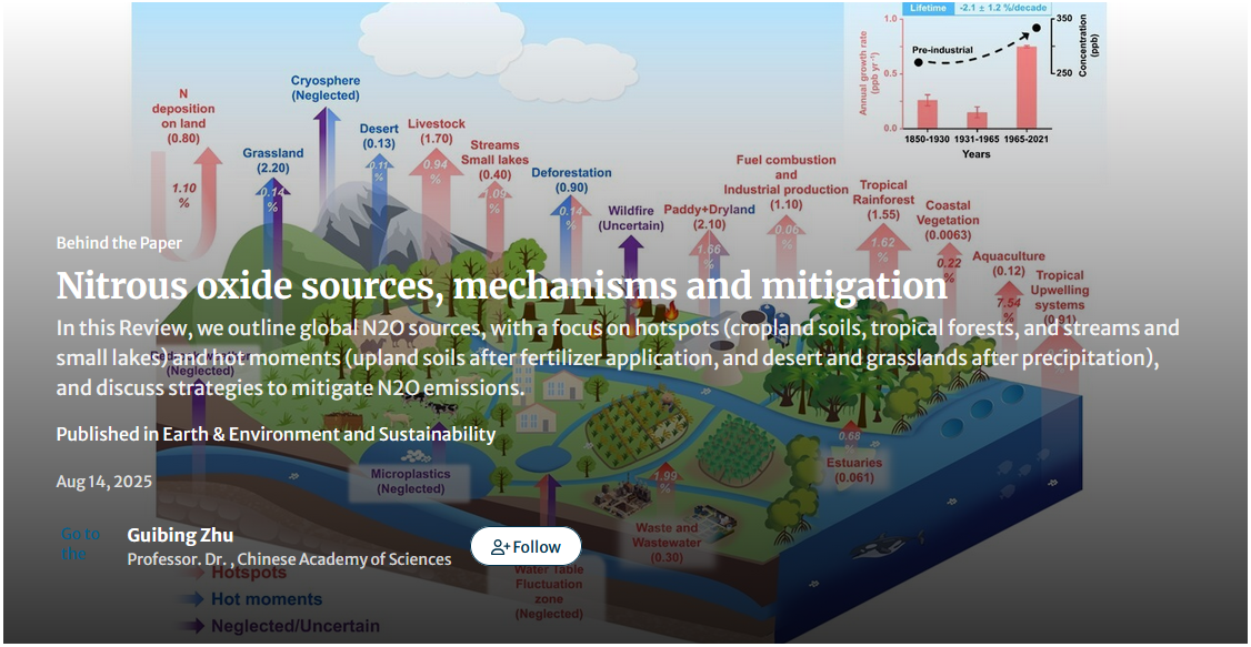 @Guibing Zhu brings together current understanding and key unknowns surrounding nitrous oxide (N₂O), one of the most powerful yet least understood greenhouse gases. By highlighting overlooked hotspots and hot moments across soils, wetlands, streams and agricultural systems, the review shows how biological pathways such as ammonia oxidation and nitrifier denitrification contribute more strongly to N₂O emissions than previously assumed.
