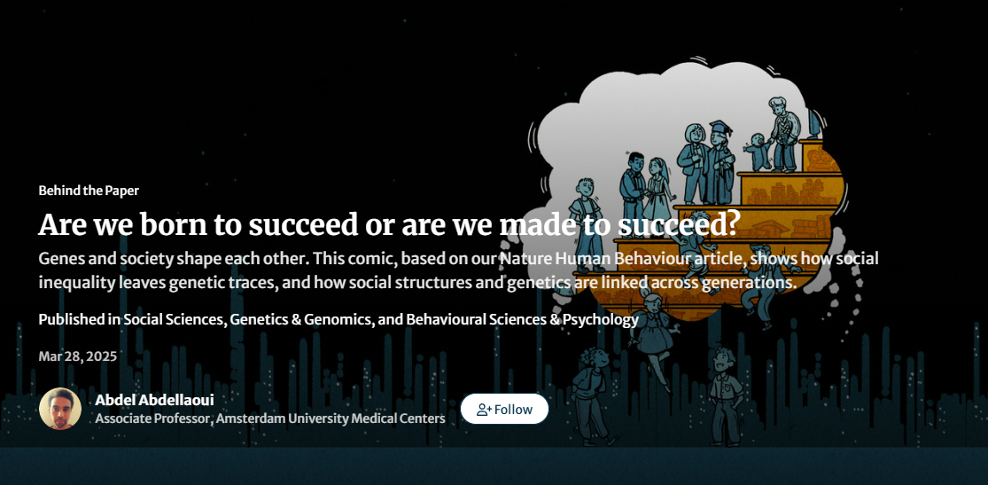 This Behind the Paper post from @Abdel Adbellaoui shares a comic that follows the journey behind a study published in Nature Human Behaviour in March. Instead of technical research details, it invites readers to explore the questions that drove the work: are we born to succeed or are we made to succeed? Through an accessible comic, the authors offer a glimpse into how the research team approached this long‑debated topic and the kinds of evidence they considered. Curious where the evidence might lead? Dive into the comic in the full post!