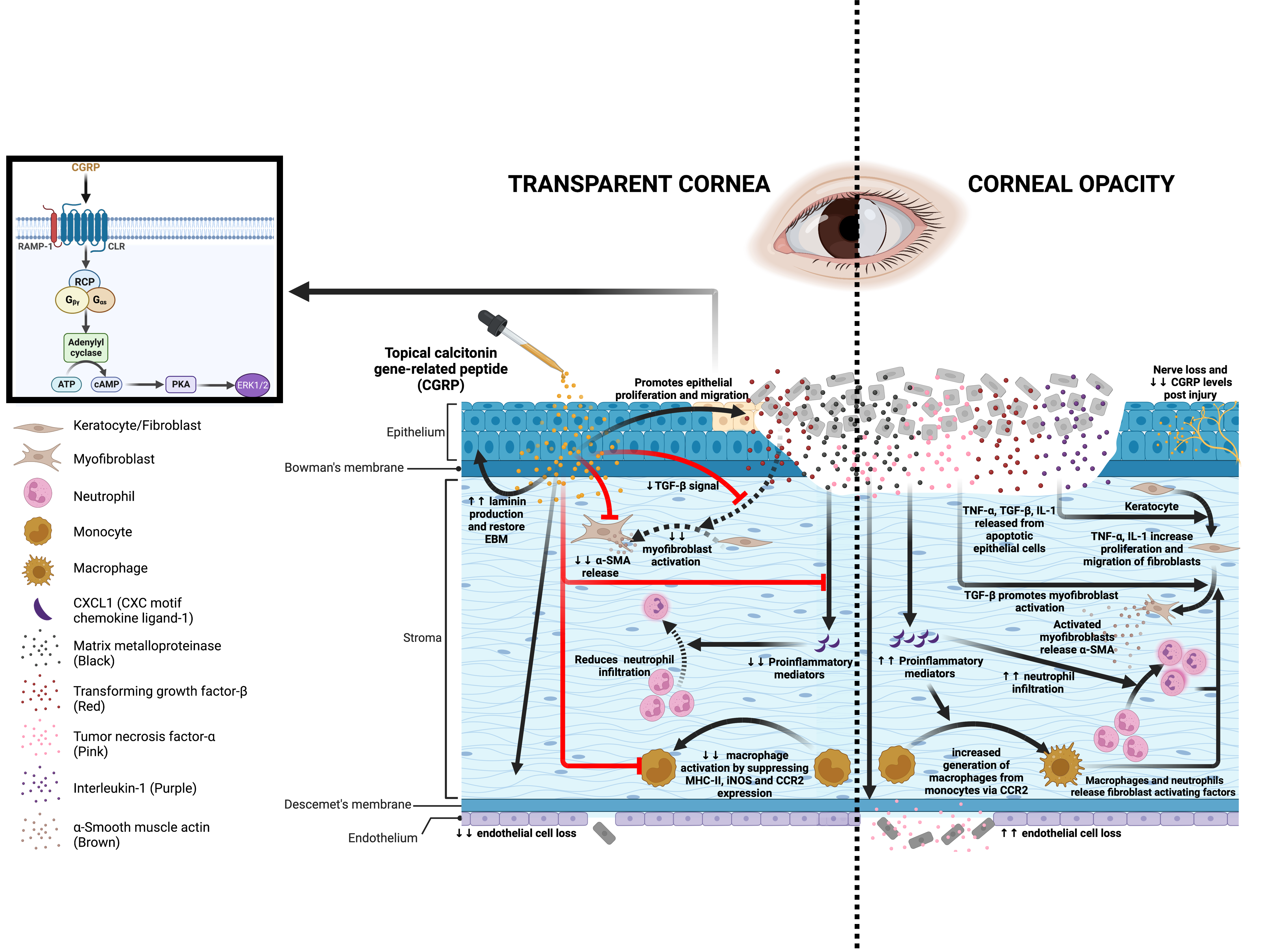 Injury leads to nerve damage and a decrease in CGRP level in the cornea. Topical application of CGRP promotes corneal epithelial cell regeneration and restores the epithelial basement membrane, thus reducing the release of pro-inflammatory and pro-fibrotic mediators including TNF-α, TGF-β, IL-1, and CXCL1 into the stroma. This leads to reduced keratocyte activation and stromal fibrosis. In addition, CGRP reduces neutrophil infiltration, macrophage maturation, and the production of inflammatory cytokines. It reduces corneal endothelial cell loss and maintains its pump function. Clinically, topical application of CGRP as an eye drop accelerates epithelial closure, preserves transparency, and prevents scar formation and edema after corneal injury.