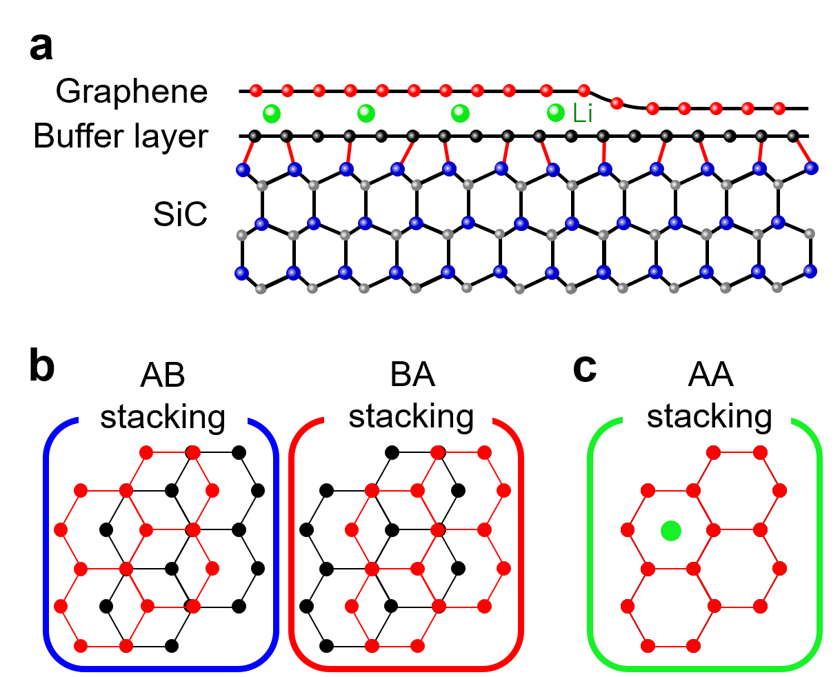 Fig. 1 Stacking structures and Li-intercalated interlayer. a Cross-section image of Li-intercalation into graphene-buffer interlayer. b, c AB, BA, and AA stacking structures.