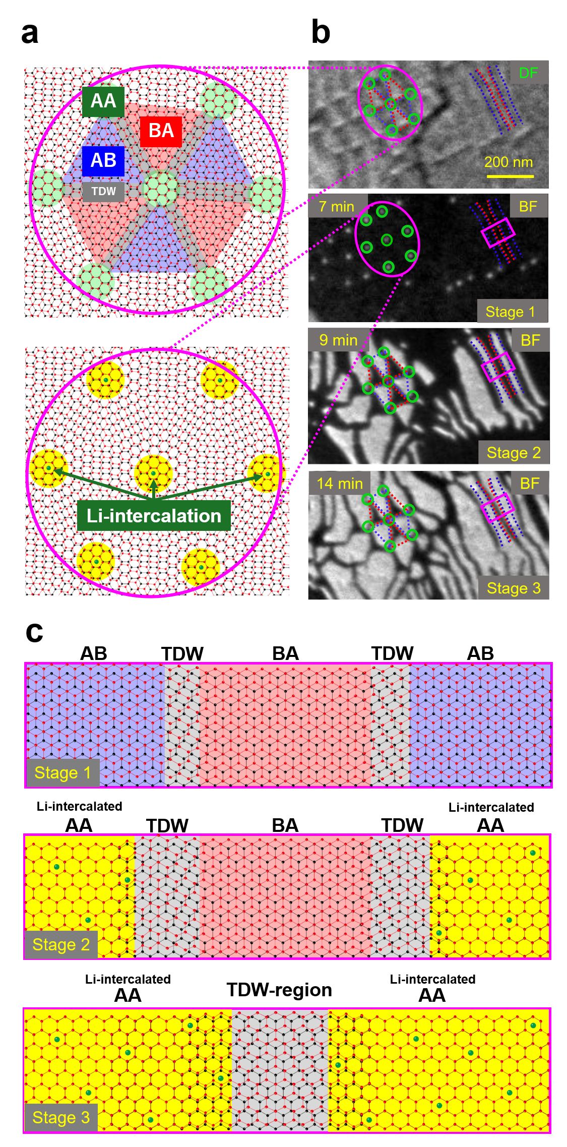 The highlights in our work mainly include: (i) Li-intercalation into the bilayer system proceeds following the initial stacking structure from AA, AB, to BA regions. (ii) Li-intercalated domains are separated by nonvolatile TDW regions because of the topological protection.