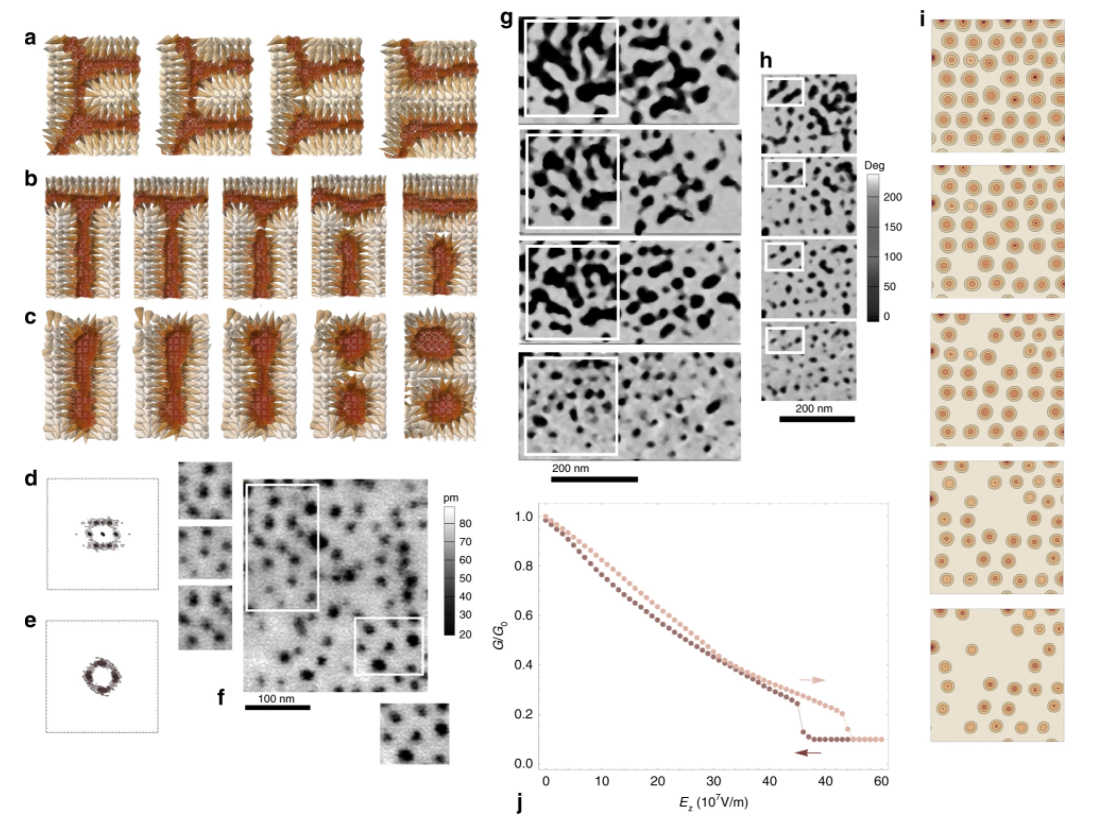 Topological transitional mechanisms and history dependence. Numerical onsets at 10 K of the disconnection processes of domains via the removal of a a fourfold junction, b threefold junction, and c the cleavage of an elongated bimeron into two skyrmions. For each division process, panels correspond to consecutive snapshots of the middle layer of Pb(Zr0.4Ti0.6)O3 80 × 80 × 5 thin film obtained upon increasing field magnitude at 10 K. d, e show the calculated structure factors at 10 K of the labyrinthine domain pattern (phase I) and of the skyrmion lattice (phase IV). f Experimental evidence at room temperature of the quasi-hexagonal arrangement of polar skyrmions as can be seen in PFM amplitude images of the PZT sandwich thin film. g, h show experimental realizations of the pattern evolution involving fourfold and threefold, and bimeron, respectively, at room temperature. Figures correspond to PFM phase images where dark to bright contrast indicates a 180° phase difference, and were obtained through successive scans under a DC bias of 1.8 V. i Progressive depletion of the skyrmions lattice upon increasing of the field within the range of values triggering the transition from phases IV–V, i.e., the transition from the skyrmions lattice to the monodomain state at 10 K. Bright to dark colors correspond to increasing the out-of-plane component of local dipoles. j Electric field hysteresis of normalized tunneling conductance G/G0 at 10 K. The reference tunneling conductance G0 corresponds to the zero-field labyrinthine state.