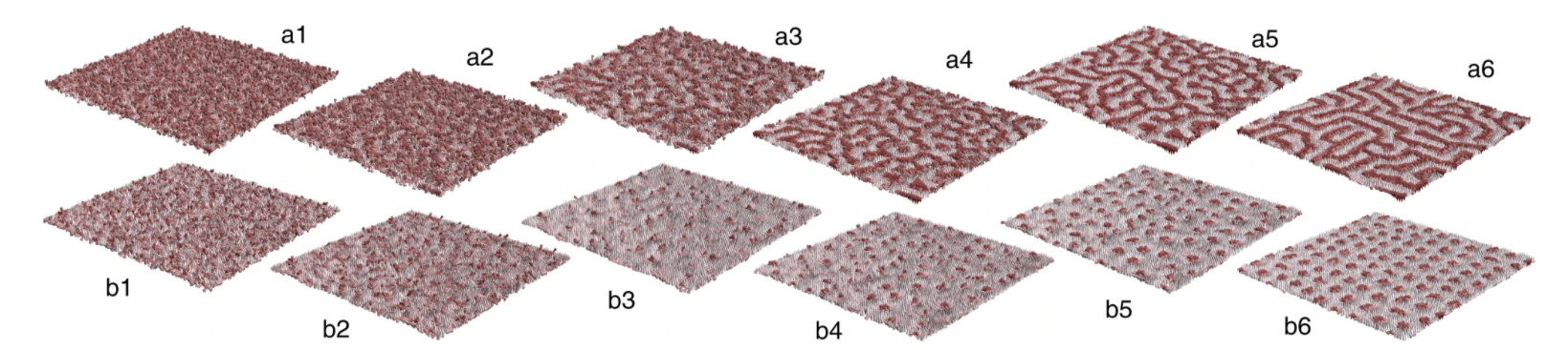 Spinodal decomposition and nucleation processes in PZT thin film. Time evolution of the dipolar pattern within the middle layer of 80 × 80 × 5 film of Pb(Zr0.4Ti0.6)O3 under zero external field (a1–a6) and under 40 × 107 V/m applied along [001] pseudo-cubic direction (b1–b6), as obtained from molecular dynamics simulations. In each of the two cases, 1–6 correspond to 150, 250, 350, 450, 750, and 1500 fs after the quench from 650 K to 10 K, respectively. While a1–a6 indicate the onset of the spinodal instability and development of the labyrinthine pattern, b1–b6 show the nucleation process leading to the bubble domain pattern. Gray (red) dipoles are oriented along [001] ([001¯]) pseudo-cubic direction.