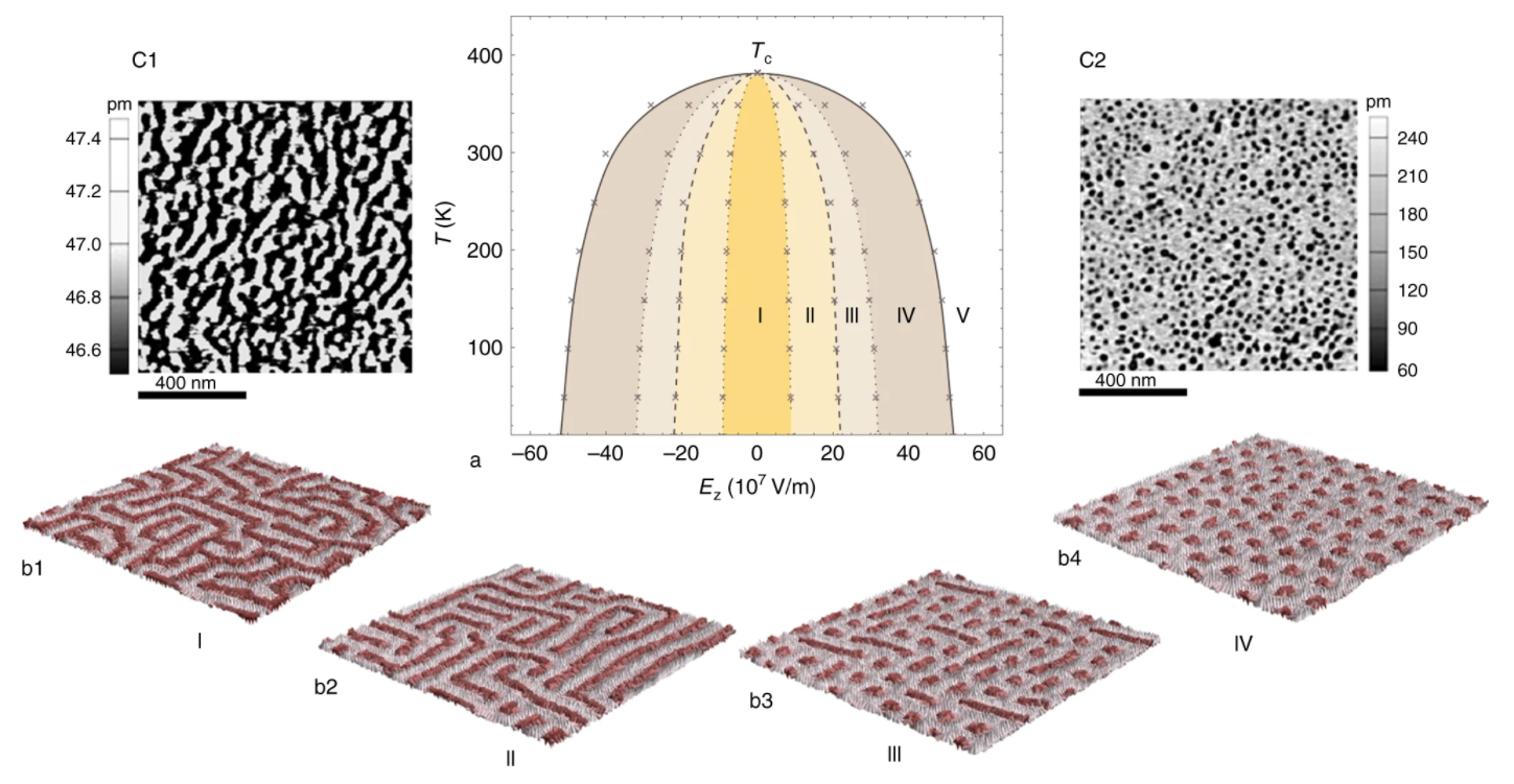 Nonequilibrium phase diagram of compressively strained low-dimensional PZT ferroelectric. a Temperature-electric field phase diagram of a Pb(Zr0.4Ti0.6)O3 ultra-thin film mimicked by a 80 × 80 × 5 supercell. Crosses correspond to transition field values calculated through the zeroth Betti number and lines interpolate between the data points obtained for 10 K and from 50 K to 350 K by steps of 50 K. Phases I and II correspond to connected and disconnected labyrinthine patterns, respectively, while phases III and IV denote the mixed bimerons-skyrmion phase and the skyrmions (or bubble) phase, respectively. Phase V corresponds to states where all dipoles are aligned along the applied field. The dashed line separating phases II from III marks the spinodal-like boundary, while the solid line separating phases IV from V marks the binodal-like boundary. b1–b4 provide dipolar configurations as obtained from simulations within each of phases I–IV in the middle layer of the 80 × 80 × 5 film at 10 K, where gray (red) dipoles are oriented along [001] ([001¯]) pseudo-cubic direction. c1, c2 show experimental PFM amplitude images of PZT films with 1 unit cells STO spacer and reveal labyrinthine and bubble-skyrmion morphologies, respectively. The labyrinth domain pattern was obtained after annealing the as-grown PZT films at 525 K for 10 min in air, and cooling it down to room temperature at cooling rate of 10–15 K/min. The bubble domains were then created by scanning the labyrinth domains using a SPM probe with an AC amplitude of 500 mV.