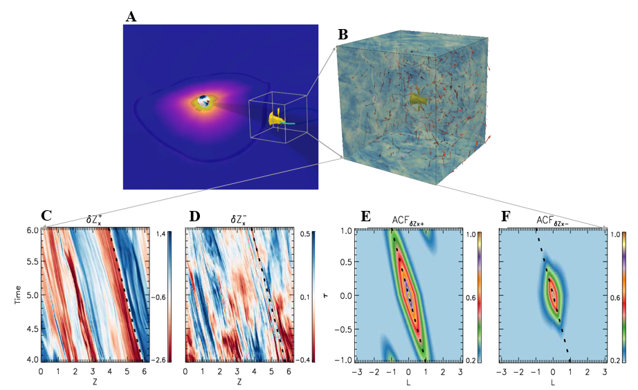 Fig.1 A schematic figure of PSP measurements and a simulation of imbalanced Alfvénic turbulence. (A) PSP’s (illustrated in yellow) near-perihelion detection of the pristine solar wind, which is colored by the number density of the solar wind. The Sun is colored by the radial magnetic field. (B) Distributions of the turbulent Elsässer variables (δZ+ and δZ-) in the simulation domain, with the color showing the magnitudes of δZ+ and the arrows denoting the directions of δZ+ and δZ-. (C and D) Time-distance (time-z) diagrams of δZx+ and δZx- ; (E and F) Distributions of the auto-correlation function (ACF) of δZx+ and δZx- in the τ (time lag)-l (spatial lag in the z-direction) plane. The black dashed lines show the expected propagation of Alfvén waves along the z-direction.