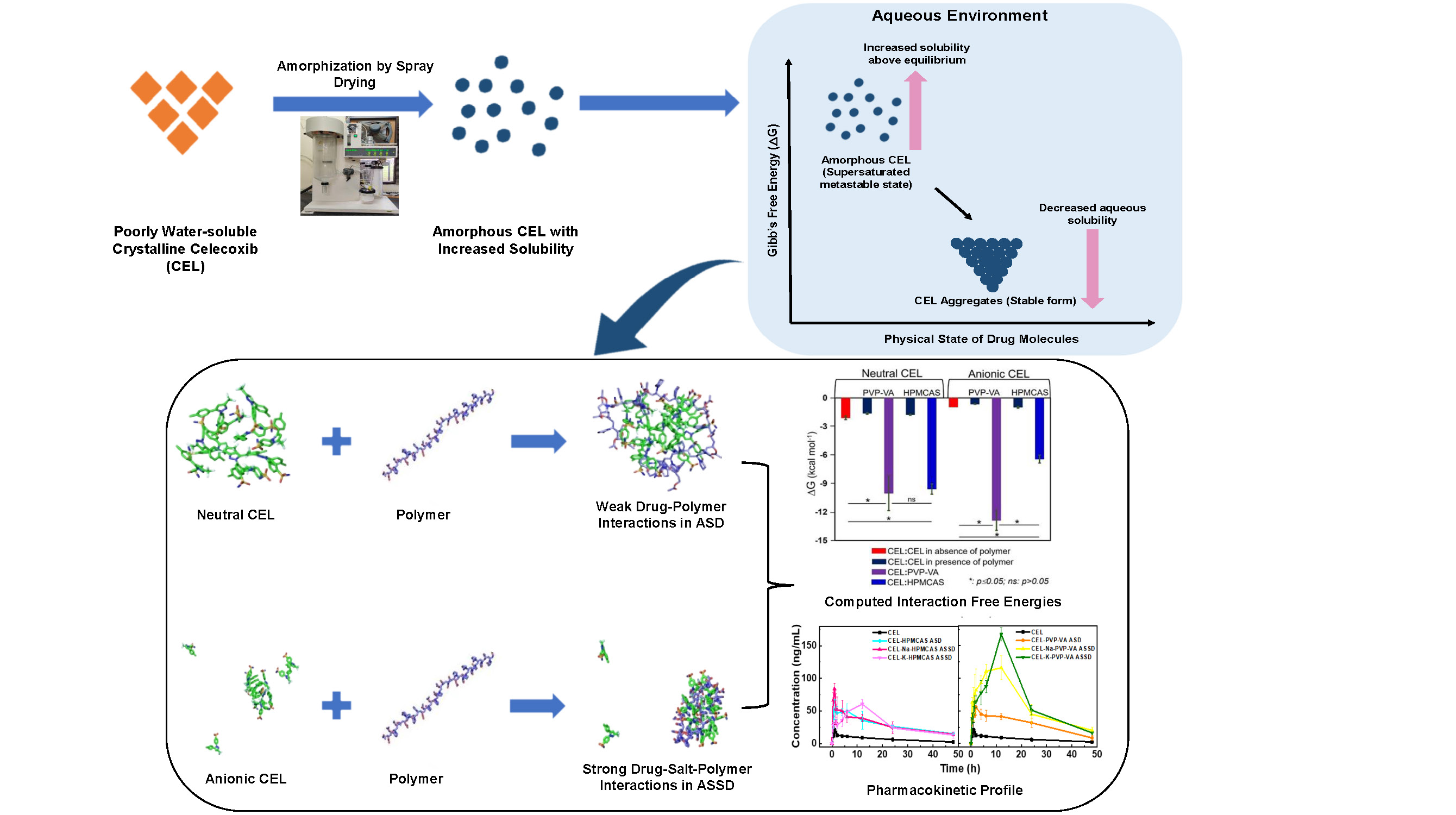 Remarkably, the simulations revealed that the drug-polymer intermolecular interactions in aqueous solution were most stable between anionic celecoxib and PVP-VA, correlating well with in vitro and in vivo experimental observations which showed prolonged stability due to strong polar interactions between drug and polymer as revealed by high-end analytical techniques, namely NMR, FTIR and Raman spectroscopy, along with ameliorated solubility, dissolution and pharmacokinetic profile for amorphous salt solid dispersions (ASSD) containing celecoxib and PVP-VA. Drug-drug aggregation was prevented due to stronger drug-polymer interactions for the ionized state of celecoxib in ASSDs compared to the non-ionized state of celecoxib in conventional ASDs. Indeed, the celecoxib-PVP-VA ASSD has the potential for improved biopharmaceutical performance compared to currently marketed formulations of celecoxib, thus enabling lower dosage regimens.