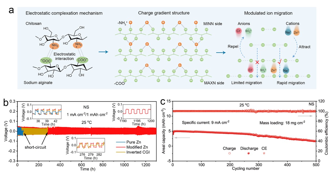 To address this challenge, we first unveil the corrosion mechanism of the Zn negative electrode in the NS, revealing that Cl- induces pitting and spontaneously forms by-products with other components as a reactant. These substantial corrosion behaviors further deteriorate the interface environment, thus aggravating dendritic deposition and causing rapid battery failure (Fig. 1b). We then propose a charge gradient interface (CGI) strategy to modulate ion transport at the interface. The gradually strengthened negative charges formed via diffusion-controlled electrostatic complexation of biomass-derived polysaccharide precursors serve to propel surface accumulation of Cl- while simultaneously accelerating the diffusion of Zn2+, thus facilitating uniform deposition, and mitigating corrosion and side reactions (Fig. 2a).