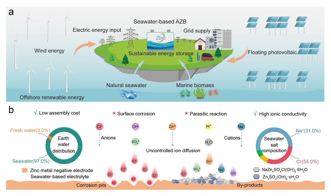 Integrating intermittent energy from renewable resources into the grid supply by energy storage technology is significant in driving a more sustainable energy future. Aqueous batteries based on water receive renewed interest in this aspect. Natural seawater (NS) offers a promising alternative to distilled water electrolytes since NS accounts for ~96.5% of Earth’s total water reserves. Paring seawater electrolyte with zinc negative electrode has emerged as one of the most sustainable solutions for offshore stationary energy storages such as those for offshore wind farms or floating photovoltaic, owing to the intrinsic safety, extremely low cost, and unlimited water source (Fig. 1a). Still, direct use of NS in the electrolyte poses greater challenges for the zinc metal negative electrode. The chloride environment (0.54 M of Cl-) and the ionic complexity (e.g., Na+, Ca2+, Mg2+) in NS significantly influence the electrode reactions.