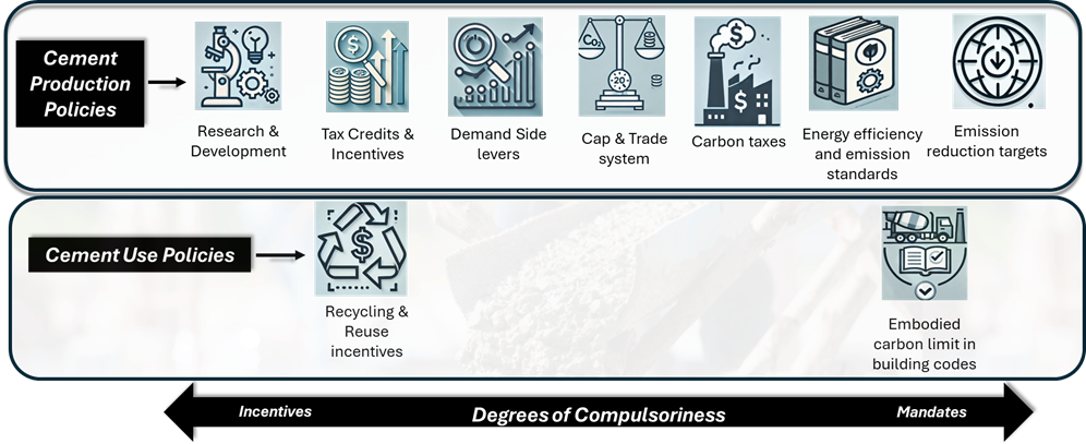 Our work emphasized that technology alone is not enough—policy intervention is crucial to accelerate industry-wide change. We explored key policy mechanisms that create incentives and demand for low-carbon cement, including: