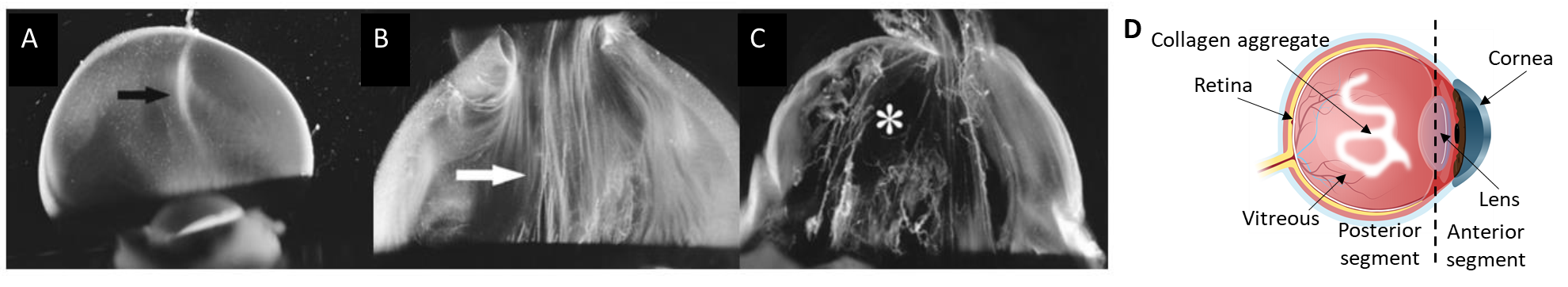 Figure 1. Dark-field slit microscopy of dissected human vitreous body reveals aging structure. (A) Homogeneous vitreous of a 33-week old fetus. (B) Fusion of collagen fibrils in the central part of the vitreous (white arrow) of an 59-year-old human. (C) Extensive fibrous liquefaction in the degenerated vitreous of an 88-year-old woman. This degeneration is accelerated in myopia and simultaneously forms vitreous opacities (D)1.