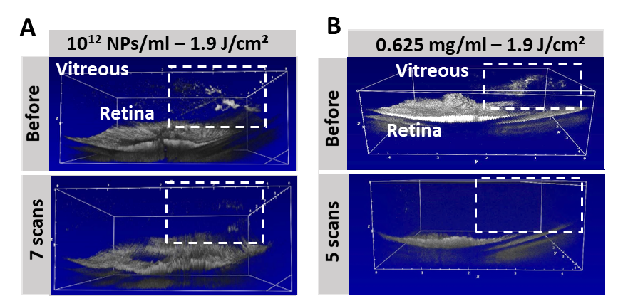 Exploiting the plasmonic properties of gold nanoparticles, surrounding water evaporates when illuminated with a pulsed-laser, forming ‘vapor nanobubbles’ (VNBs). In 2019, we reported that when nanobubbles collapse, the accompanying mechanical forces destroy vitreous opacities onto which gold nanoparticles are bound.2 This was achieved with a laser fluence 1000 times lower than currently used clinically. These in vitro and ex vivo studies showed proof of principle requiring corroboration in vivo, but no experimental model existed.