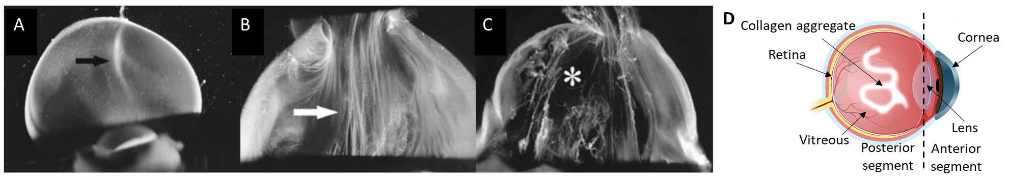 Figure 1. Dark-field slit microscopy of dissected human vitreous body reveals aging structure. (A) Homogeneous vitreous of a 33-week old fetus. (B) Fusion of collagen fibrils in the central part of the vitreous (white arrow) of an 59-year-old human. (C) Extensive fibrous liquefaction in the degenerated vitreous of an 88-year-old woman. This degeneration is accelerated in myopia and simultaneously forms vitreous opacities (D)1.