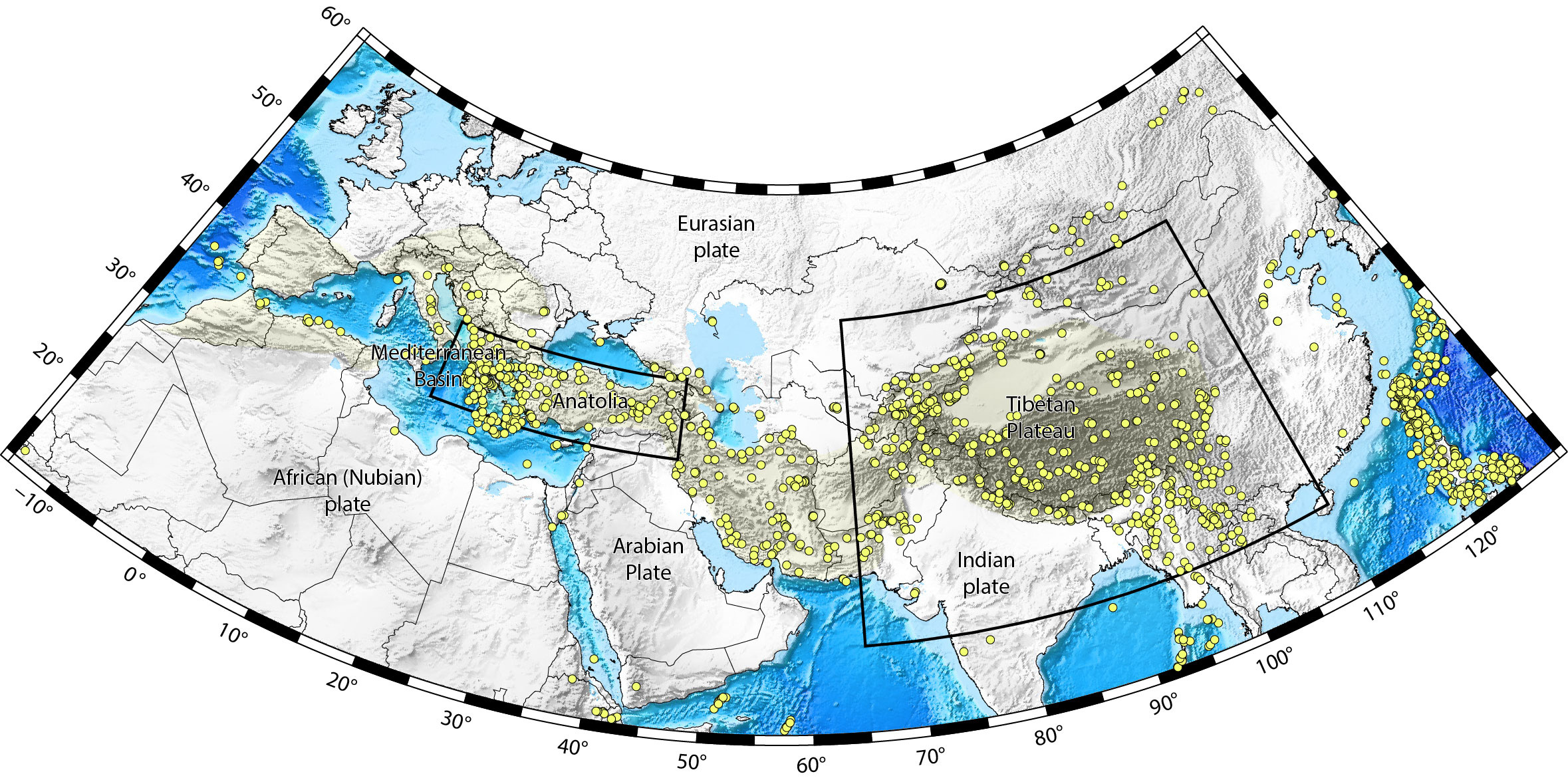 Figure 1. Seismic activity in the Alpine-Himalayan Belt, a vast mountain range system that stretches at a distance of over 8,000 kilometers across Eurasia, from the Alps in Europe through the Mediterranean region, the Middle East, Central Asia, the Himalayas, finally terminating in Southeast Asia. Modeling of deformation in Anatolia (Barbot & Weiss, 2021) and the Tibetan Plateau (Wang & Barbot, 2023) is marked with black boxes.