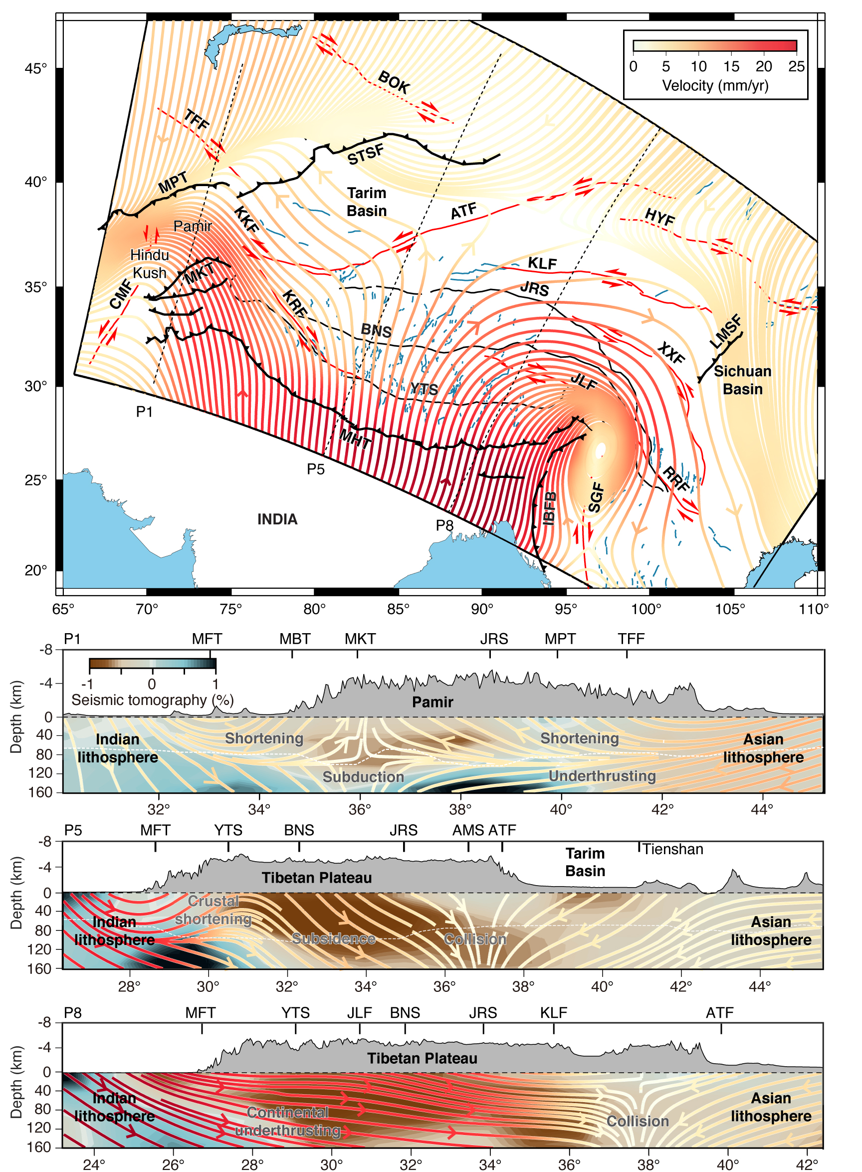 Figure 2. Three-dimensional kinematics of the Indian-Eurasian diffuse collision zone. In map view the streamlines of the velocity field are characterized by lateral extrusion centered on Central Tibet, where the east-west extension is accommodated by a dense network of rifts (blue traces). In accompanied with the North-South shortening, this tectonic escape is facilitated by major strike-slip faults (red traces) on its path, and extrudes from the west and east outlets, north of the Himalayan syntaxes. Cross-sectional view in the lower panels reveals the mechanisms of continental tectonics, with a direct collision of the Indian and Eurasian lithosphere below the Pamir and Hindu Kush, crustal shortening and delamination rollback in the western Himalayas, and continental underthrusting closer to the eastern syntaxis. The line color represents velocity amplitude and the underlying color map in the lower panels shows seismic velocity.