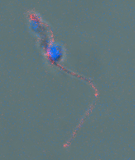 Immunofluorescence staining of T. vivax with rabbit anti-IFX antiserum (red) counterstained with DAPI (blue) demonstrates localization of IFX to the flagellum