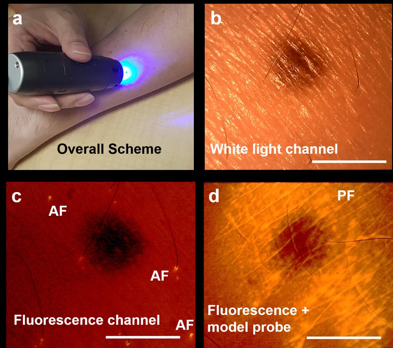 Figure 2: Hand-held fluorescence detection on a clinical patient. a) Hand-held fluorescence detector applied to a suspected lesion on the patient’s skin (mole). b) Near-view of mole using the white-light channel. Scale bar represents: 2 mm. c) Fluorescence channel of bare skin (without probe). Specks of autofluorescence (AF) can be seen at the location of hair follicles. d) Probe fluorescence (PF) can be detected following topical application. A model probe (DiI fluorescence dye) was emulsified with Aquaphor® cream and smeared in the vicinity of the lesion.