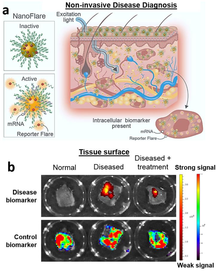 Figure 1: Non-invasive disease diagnosis using skin-penetrating nanotechnology. a) Skin-penetrating nanotechnology – NanoFlares interact with target biomarkers (mRNA) and become active, generating strong fluorescence signal. Upon topical application, NanoFlares penetrate the skin barrier and interacts with disease cellular biomarkers found within skin tissue. The fluorescence signal is then externally-collected. b) Imaging skin surfaces containing ‘Normal’, ‘Diseased’ and ‘diseased + treatment’ (treated with TGFβ inhibitors) cells. NanoFlares are topically applied on skin surface to detect disease biomarkers. Control biomarkers indicate the approximate number of cells (adapted from Figure 6b of our paper).