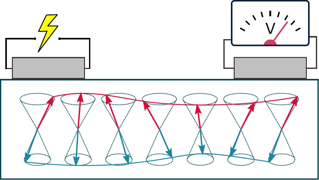 An electrical current in a platinum wire (left) creates a magnetic wave in the antiferromagnetic iron oxide (red and blue waves). This is measured as a voltage in a second platinum wire (right). The red and blue arrows represent the antiferromagnetic order of the iron oxide (© Joel Cramer)