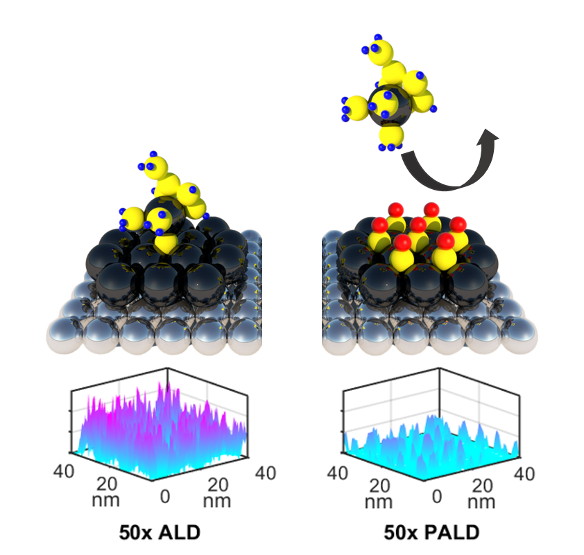 Maximizing noble metal utilization has been challenging, even for ALD that is named after the atomic layer. Most ALD processes are not depositing atomic monolayer layer-by-layer, but rather stacking up of fractions of atomic layers. Most likely, atoms would like to build on each other, forming nanoparticles instead of wetting the catalyst support. Directed by my heterogeneous catalysis experiences, I started testing the idea of lowering affinities between Pt and Pt precursors using surface passivation gas (carbon monoxide in this case) with our lab's scanning probe microscopy physicist Dickson Thian. There has been pioneering work led by the Moffat group (Science, 338(6112), p1327, 2012) on using carbon monoxide during electrochemical deposition of Pt. With ALD, the substrate surface is subject to a leaner precursor environment. The process temperature can also be leveraged to tune the adsorbate-adsorbent interaction between Pt and carbon monoxide. Besides, ALD is not limited to conductive substrates. After achieving lowered growth rates and nanoparticles with suppressed thicknesses with passivation gas incorporated atomic layer deposition (PALD) on Au and SiO2 substrates, we moved on to demonstrate the practicality of using PALD in making catalysts with enhanced performance.