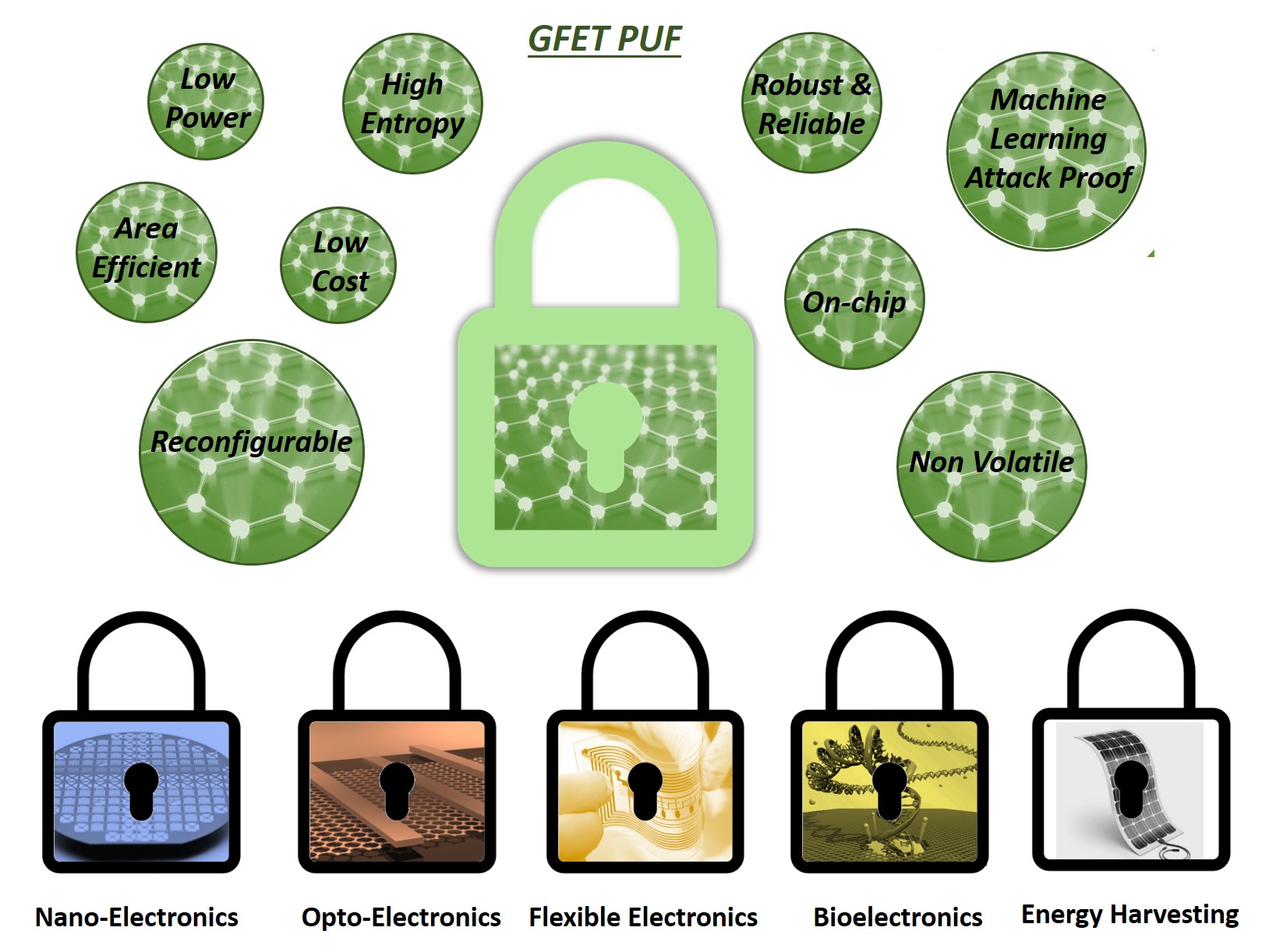 A robust, reliable, high entropy, low cost, low power, area efficient, reconfigurable, non-volatile, and on-chip security for graphene based nanoelectronic, optoelectronic, flexible electronic, bioelectronics and energy harvesting devices by exploiting the inherent disorders associated with the carrier transport in graphene field effect transistor (GFET) arrays.
