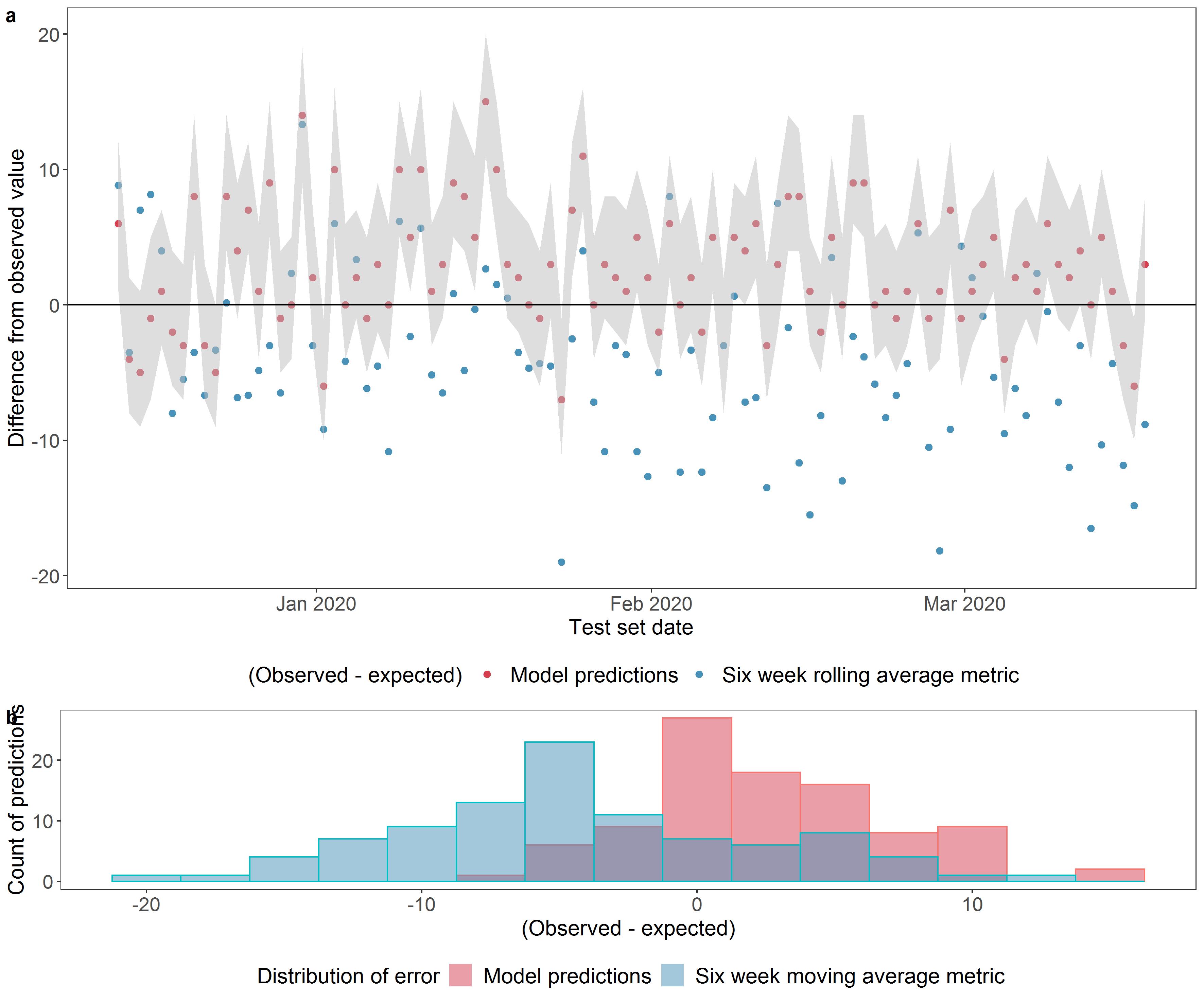a shows the difference between the observed number of admissions and the expected value from the probability distribution for the pipeline model predictions (the red dots) and between the observed number of admissions and expected value from the benchmark (the blue dots). Where the expected value equals the observed value, the dots fall on the x axis (y = 0). The grey shaded band represents the range of probability between the 10th and the 90th centile of the cumulative probability distribution of the model. b shows the distribution of errors (difference between observed and expected). The pipeline model gave a mean absolute error (MAE) of 4.0 admissions (mean percentage error of 17%) versus 6.5 (32%) for a benchmark metric.