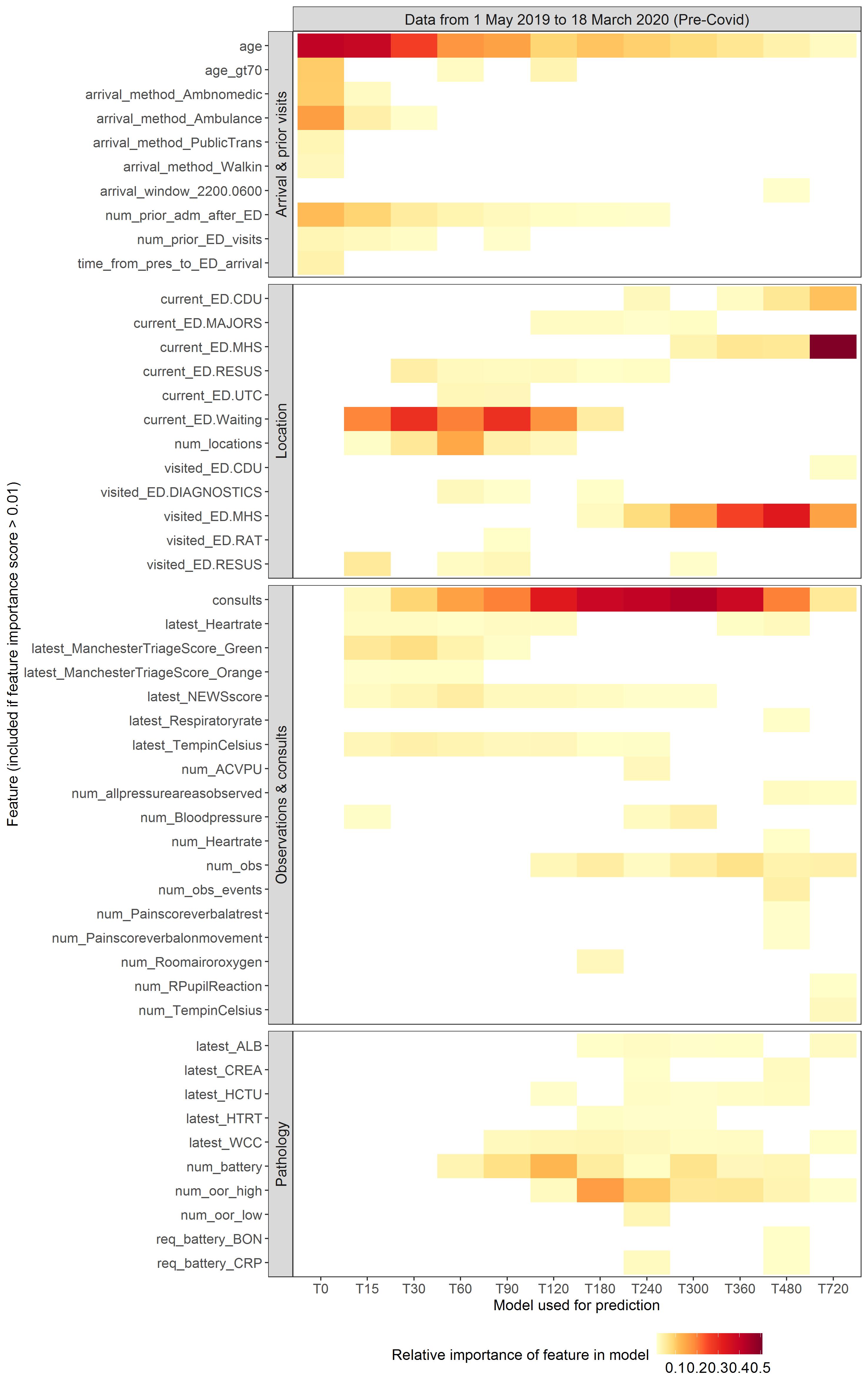 The vertical axis lists the features in each model, presented for ease of interpretation in four groups (visit data, location history, observations and consults, and pathology). See the paper for a glossary explaining these terms. The horizontal axis shows each of the 12 models. T0 was a model trained only on data available at 0 min after each patient’s arrival was first recorded in the EHR. T15 was trained on data available up to 15 min after arrival, and so on. The colour intensity reflects the relative importance of each feature within each model.
