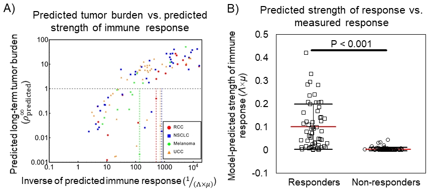 We applied the model to data from 124 patients who received checkpoint inhibitor treatment in order to test its performance in quantifying the strength of immune response. These patients had either renal cell carcinoma (RCC), non-small cell lung cancer (NSCLC), melanoma, or urothelial carcinoma (UCC), and were treated with one of the checkpoint inhibitors nivolumab or atezolizumab, thus representing a diverse sampling of cancer and drug types. The model was also used to predict the strength of treatment response for each drug-cancer type pairing examined. These results were then further validated in 177 additional patients from our in-house clinical trials. Briefly, we observed that the strength of immune response predicted by the model was significantly correlated (P < 0.001) with predicted long-term tumor burden (Figure 1A), which we found to be a reliable predictor of the tumor burden that was measured at last patient follow-up. This allowed us to stratify patients based on their model-predicted clinical response, where we defined responders to have reduced tumor burden at last follow-up, while non-responders had increased tumor burden despite receiving checkpoint inhibitor immunotherapy (Figure 1B). Furthermore, we found that the model predicted patient response with accuracy ranging 77–100%, depending on the drug-tumor combination examined. Using our model, we designed an overarching measure of the strength of immune response, which we calculated by weighting the tumor kill rate by the immune state within the tumor, calculated as Λ×μ.