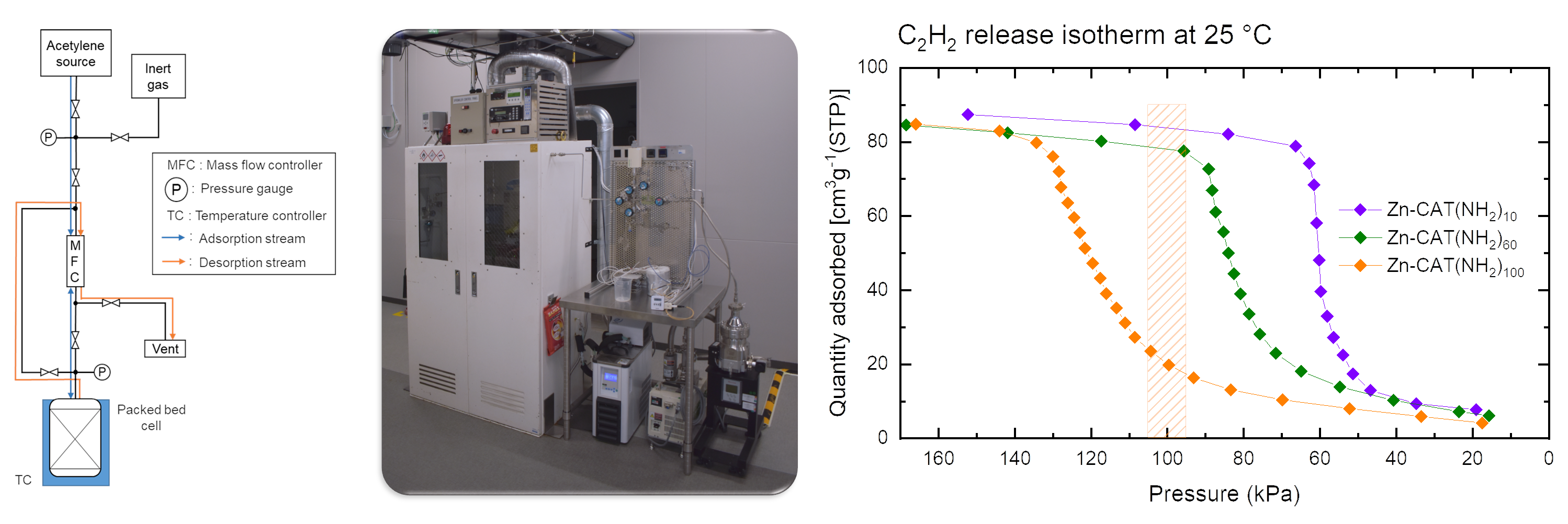 Applying this knowledge, we have successfully developed a material suitable for the target application, which is to store large amounts of acetylene loaded at a low pressure (less than 2 bar) to avoid the risk of explosion while releasing it under near-ambient conditions (1 bar). The ability to release the stored gas under ambient conditions is essential because it presents an opportunity for the recovery and use of the stored gas without the need for heat or vacuum as triggers for its release from the storage substrate. The performance of this material was demonstrated using a prototype cylinder on a dedicated test bench developed at the Air Liquide Innovation Campus Tokyo. Using the porous material as a filler in acetylene gas cylinders, it is possible to fill large volumes of acetylene (90 cm3 cm-3) at a safe pressure with high recovery rates of > 75%, which is not achievable with conventionally-used adsorbents.