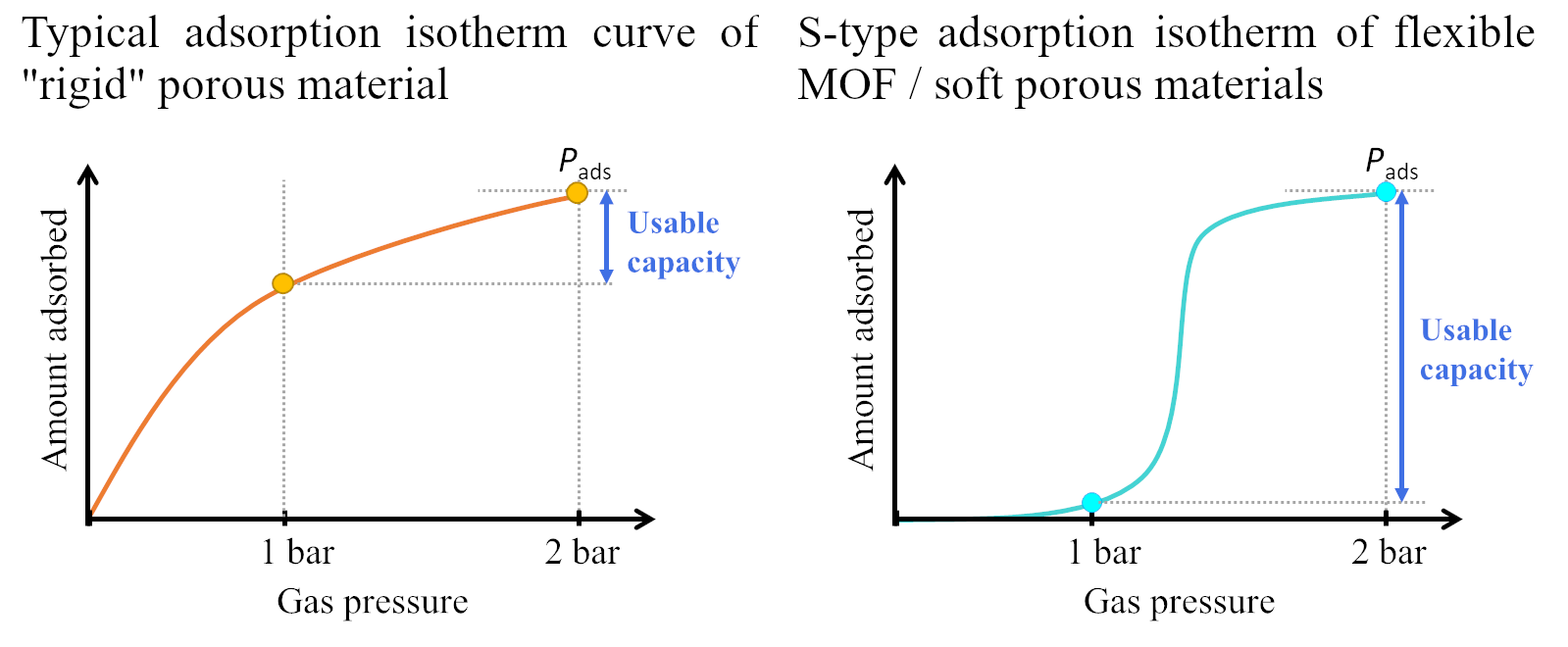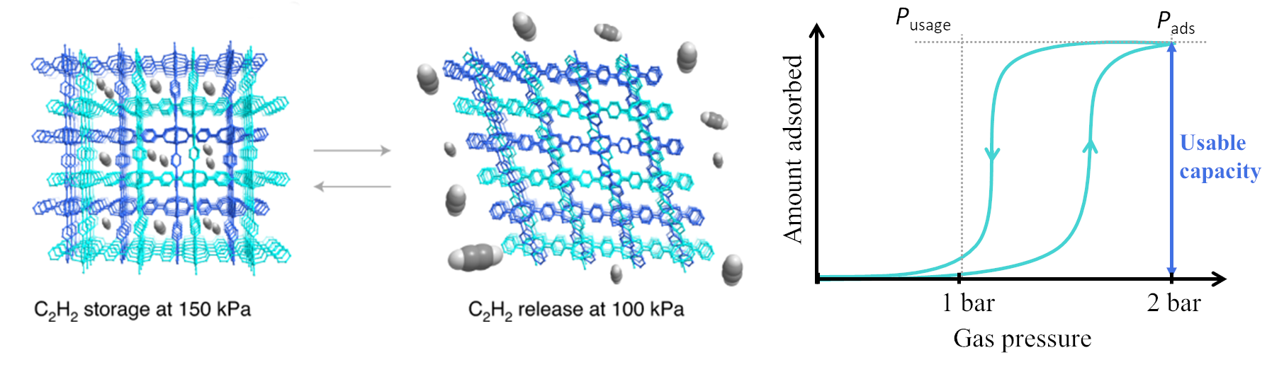 This study focused on porous coordination polymers (PCP) or metal-organic frameworks (MOF) with structural flexibility. MOFs are crystalline materials composed of organic molecules linking metal ions, forming a porous framework with a pore size ranging from 0.1 to a few nanometres, similar to that of nanoporous sponges. For the tuneable sorption of acetylene, we developed a solution based on flexible MOFs, a unique type of adsorbent pioneered by the Pr. S. Kitagawa Laboratory at Kyoto University, which can spontaneously release the gas stored in its nanopores, resulting in typical S-shaped adsorption curves.