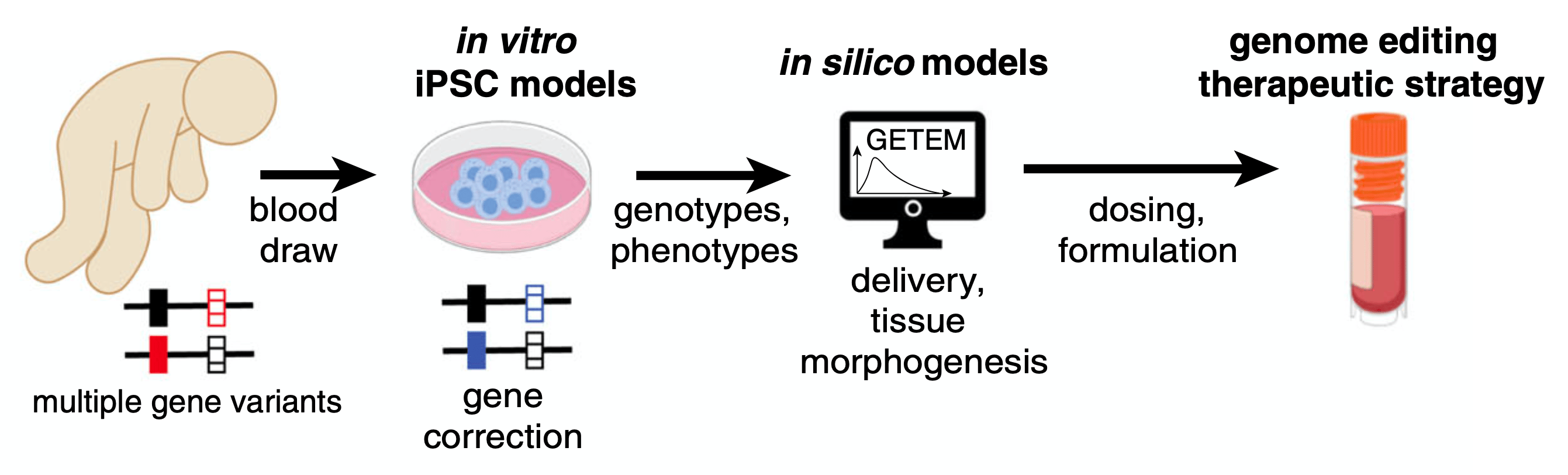 Figure 1. A combined in vitro and in silico platform for evaluating genome editing strategies2. Schematic indicating the modeling approach in which samples from patients are collected ex vivo and then genome-edited in vitro. Genotypes and phenotype outcomes from the in vitro studies are inputs for an in silico model that simulates the delivery of the therapeutic in vivo as well as tissue morphogenesis. The results of the in silico model can ultimately guide dosing and formulation decisions.