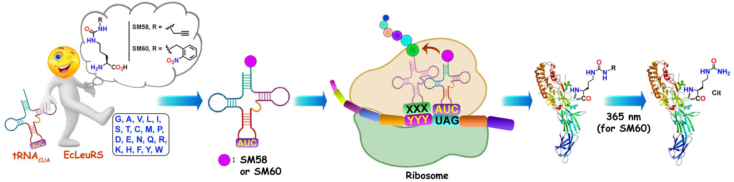 To incorporate a citrulline, the key challenge is that it is similar in size and shape to arginine. As such, here are few molecular determinants that can be exploited to develop an engineered synthetase that selectively incorporates citrulline. Chatting with co-author Abhishek Chatterjee at the Bioorganic Gordon conference, we considered that the addition of a bulky group (that could be selectively deprotected) might make it possible to incorporate a citrulline into a protein. To that end, Santanu developed two analogues, SM58 and SM60, that can be post-translationally converted into citrulline using either a Pd-catalyst or 365 nm light. Screening of these compounds against various engineered aaRS/tRNA pairs identified an E. coli-derived leucyl-tRNA synthetase (EcLeuRS)/leucyl-tRNA (tRNACUA) pair4 suitable for robust expression of citrullinated proteins in mammalian cells (see figure). We used SM60 for further studies owing to the high spatiotemporal control of photochemical conversions. Using this technique, we incorporated Cit at two known autocitrullination sites, R372 and R374 of PAD4 and biochemically characterized their effects on PAD4 activity.