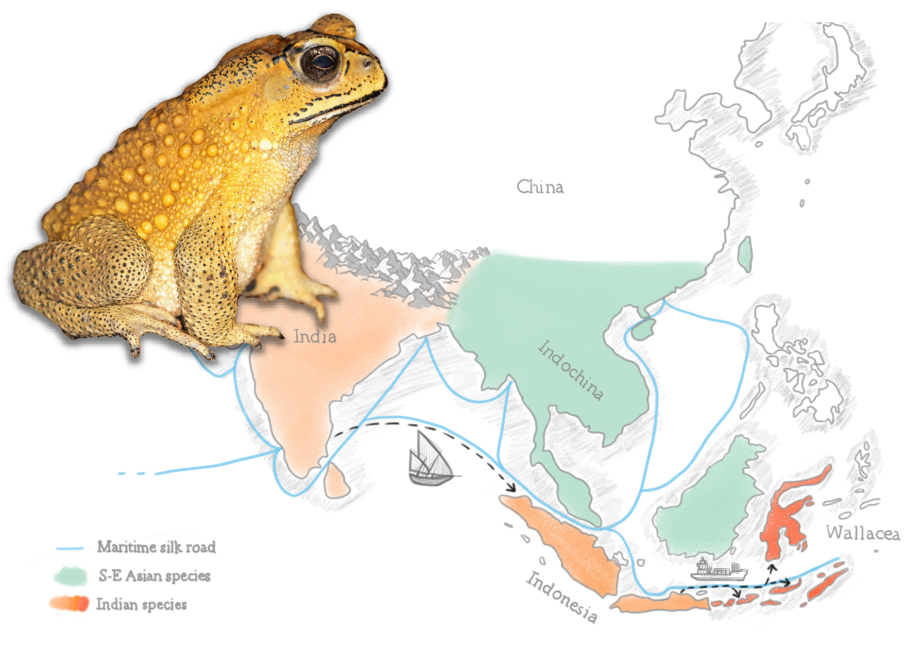 Photograph of the Asian black-spined toad from Thailand (© Christophe Dufresnes) and artwork summarizing the distribution ranges of the two species its is composed of (© Johanna Ambu). The presumed arrival of the toad from India (light orange) to Indonesia (orange) by the maritime silk road is illustrated by the sailing ship, and its subsequent expansion into Wallacea (red) within the last decades is illustrated by the container ship.