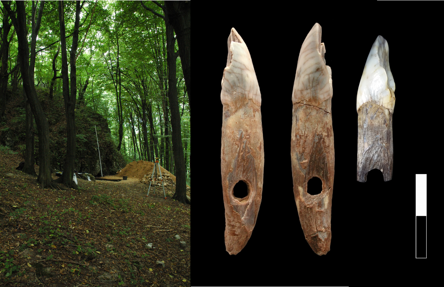 Borsuka Cave site and pendats made from European elk incisors (photo by Jarosław Wilczyński and Nina Kowalik)